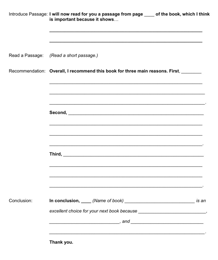 The purpose of this assignment is to challenge students to (a.) strengthen their public speaking skills, (b.) practice writing an interesting and logically organized presentation, (c.) showcase their skills of summarizing and reflecting upon their reading, (d.) inspire others to want to read their books, and (e.) promote literacy to contribute to our culture of learning.