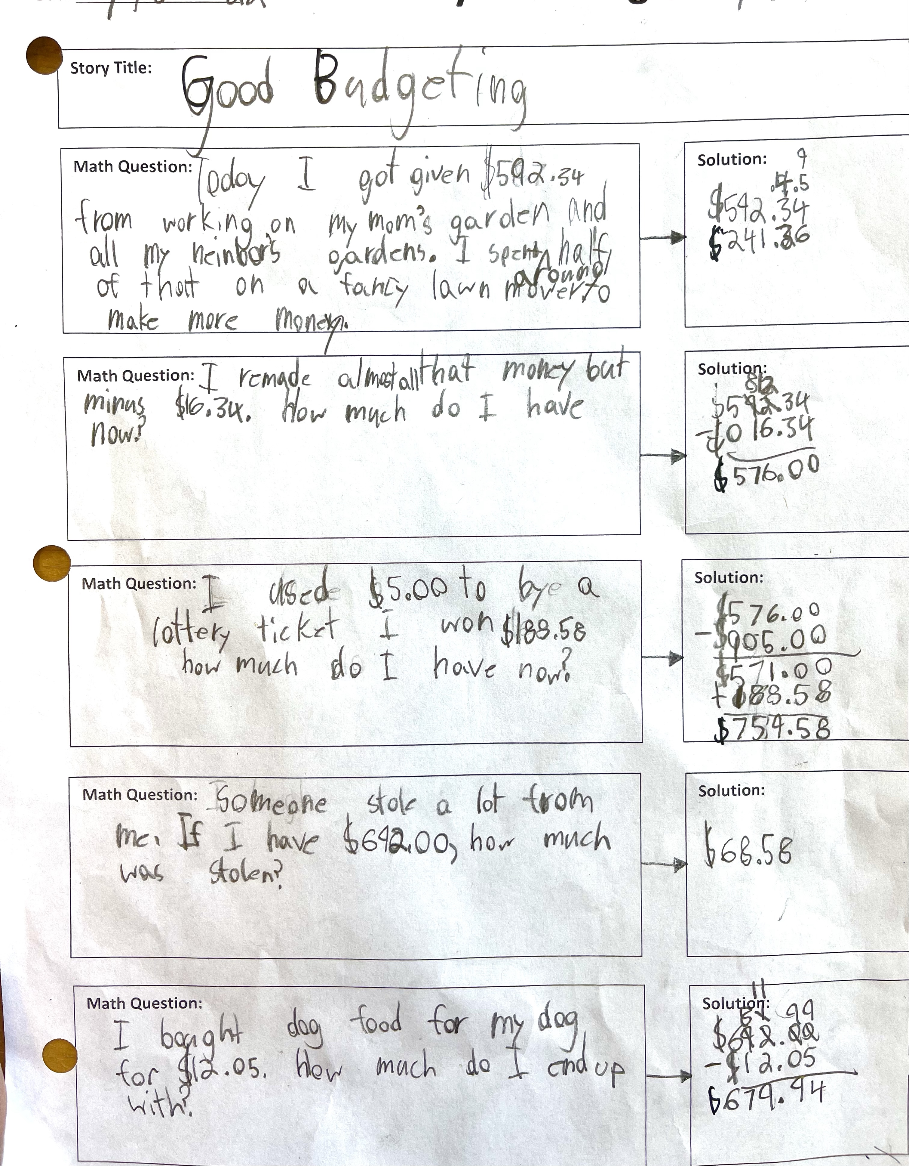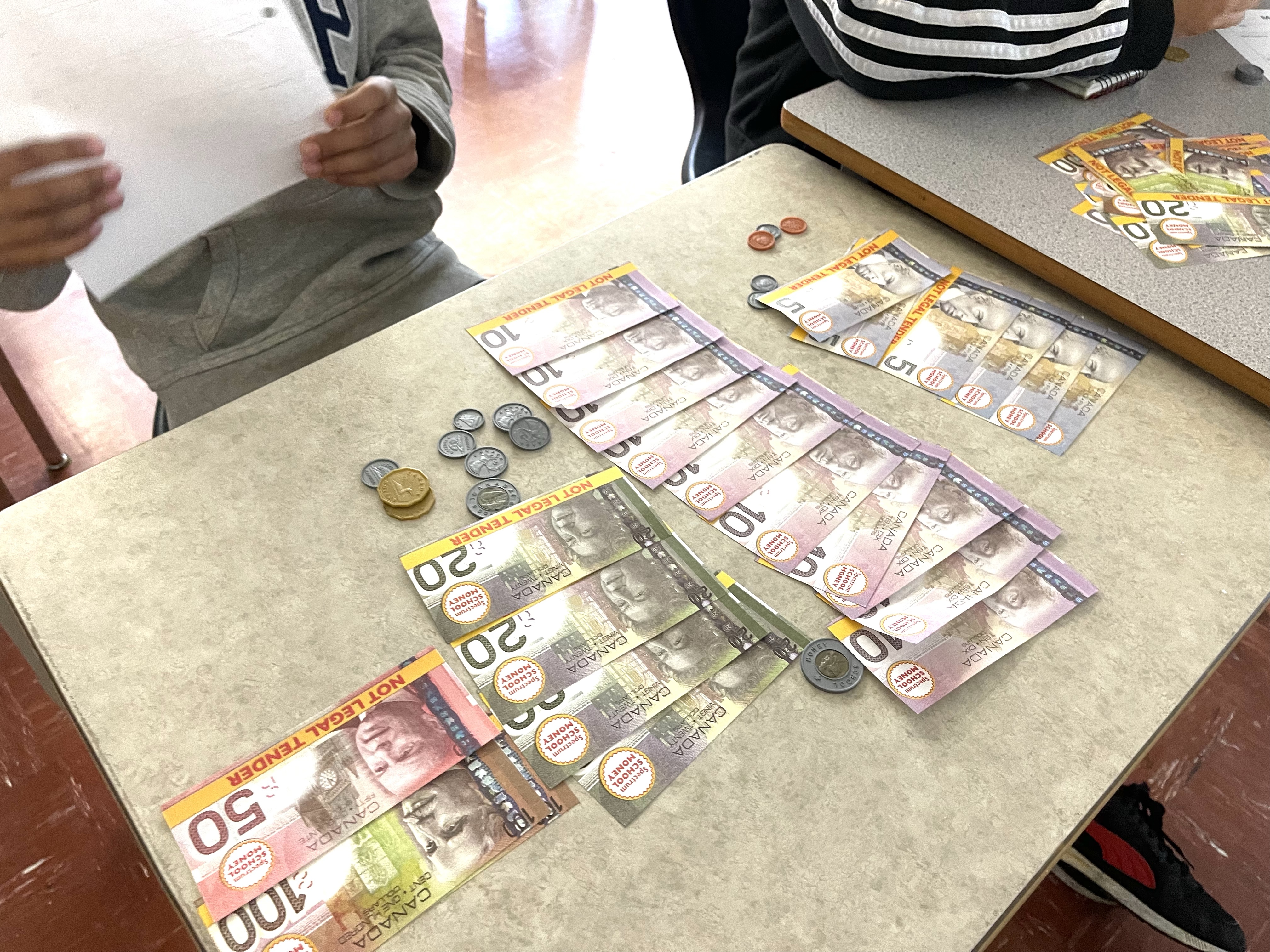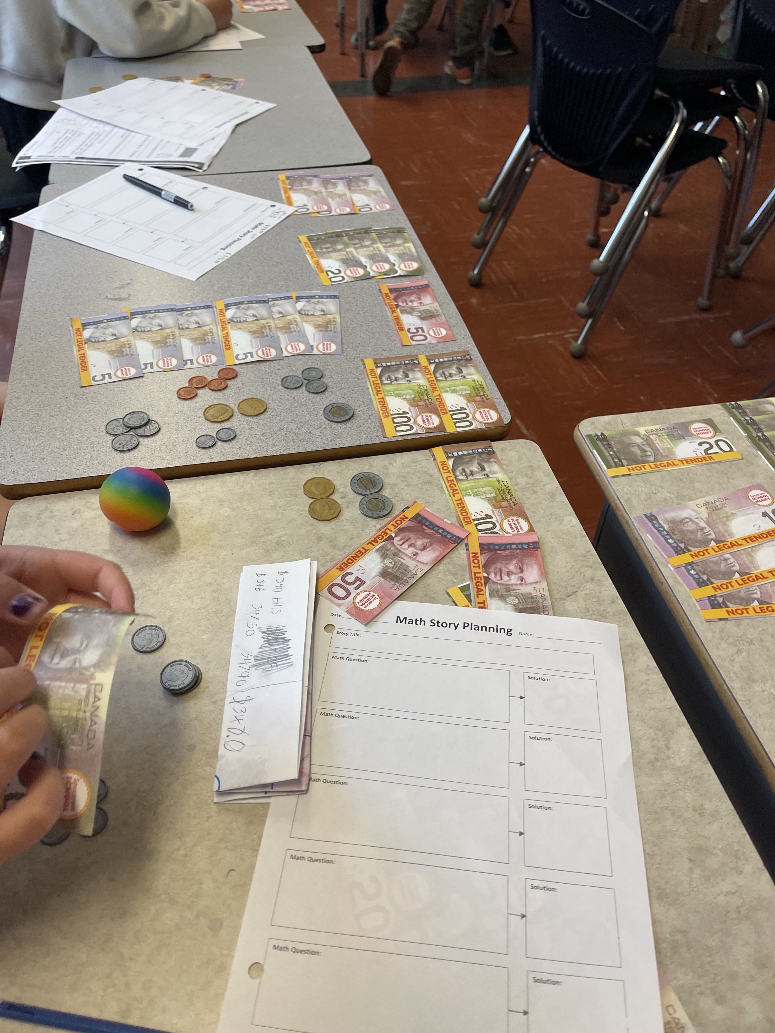 As well, here is a peak at the math we have been exploring. This morning I told the students that they would “find a few hundred dollars on each desk”. I invited them to get to know the features of the currency, add it up, and create a multi-question “math story” about the money. The students were so excited to make deals and buy and sell things. It was fun to see their joy in the play of striking it rich. Hahah!