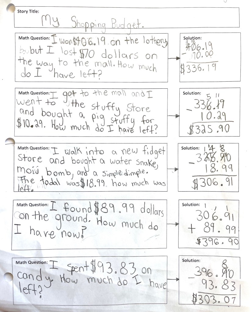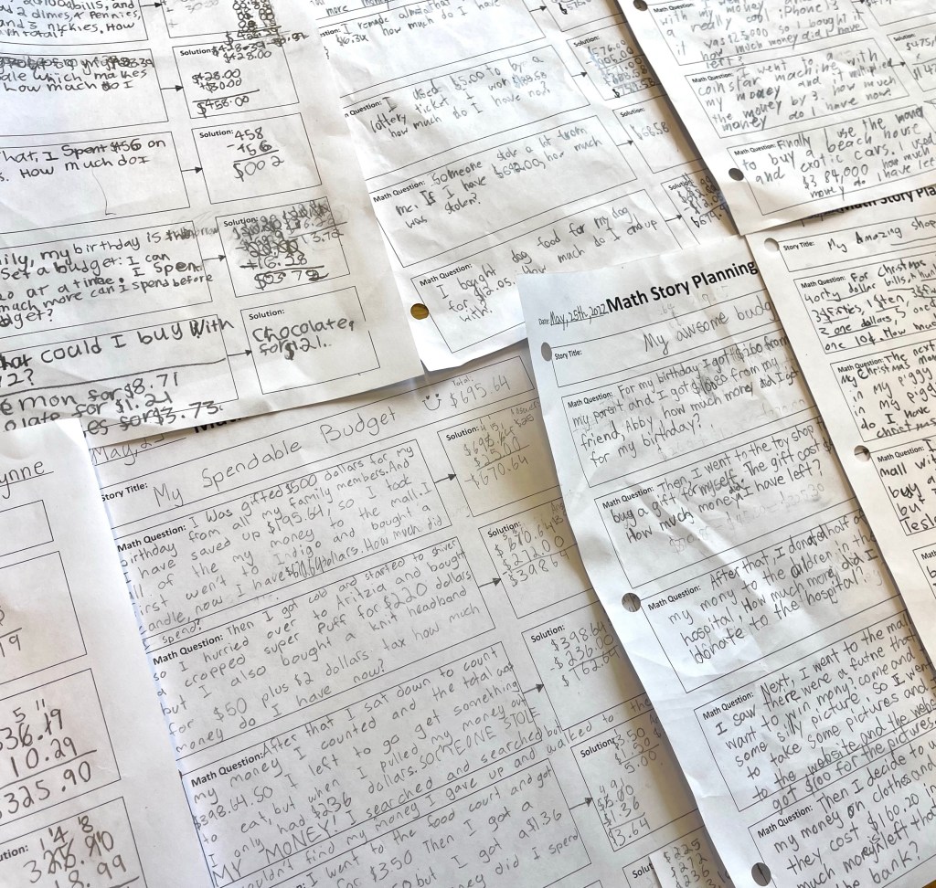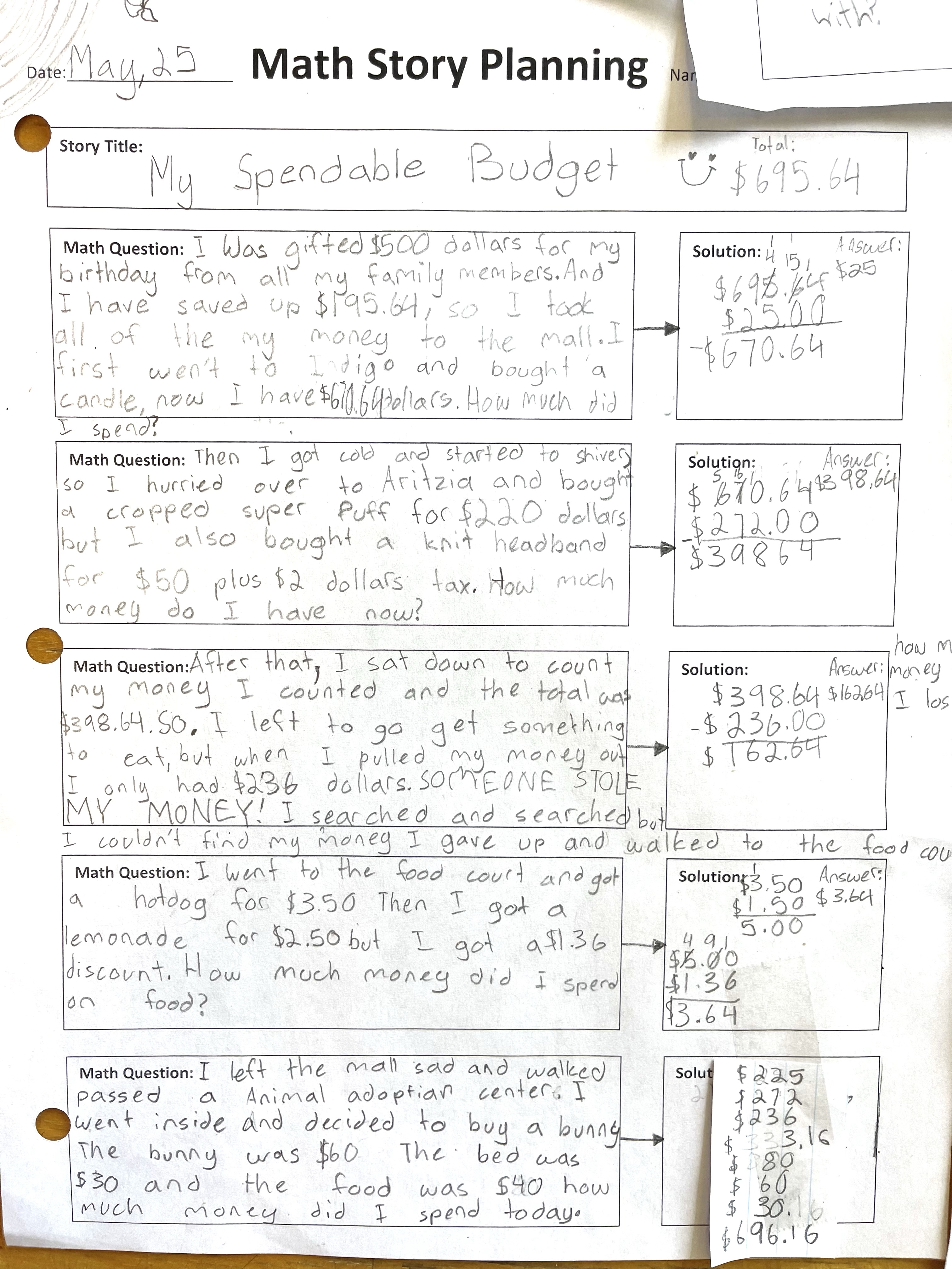 As well, here is a peak at the math we have been exploring. This morning I told the students that they would “find a few hundred dollars on each desk”. I invited them to get to know the features of the currency, add it up, and create a multi-question “math story” about the money. The students were so excited to make deals and buy and sell things. It was fun to see their joy in the play of striking it rich. Hahah!