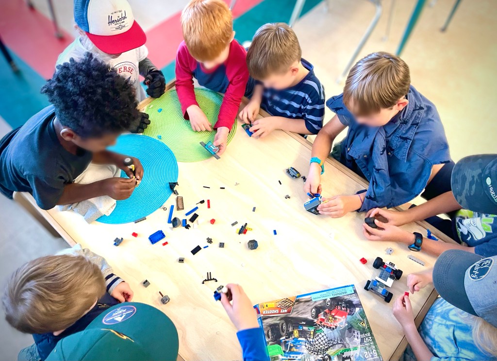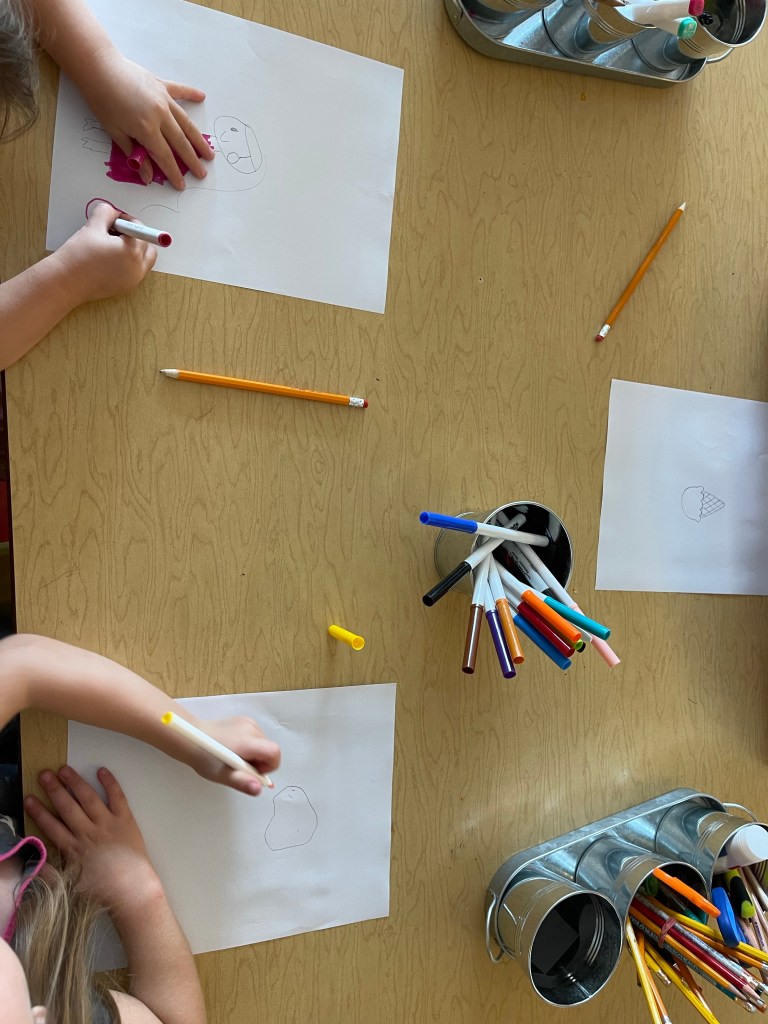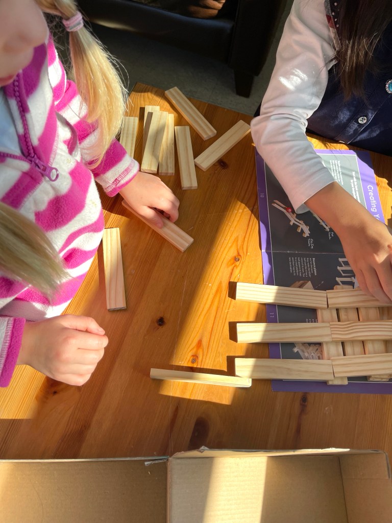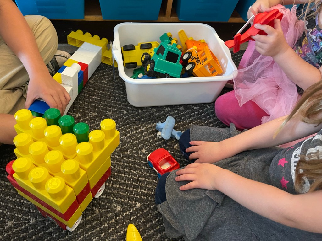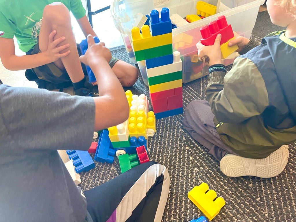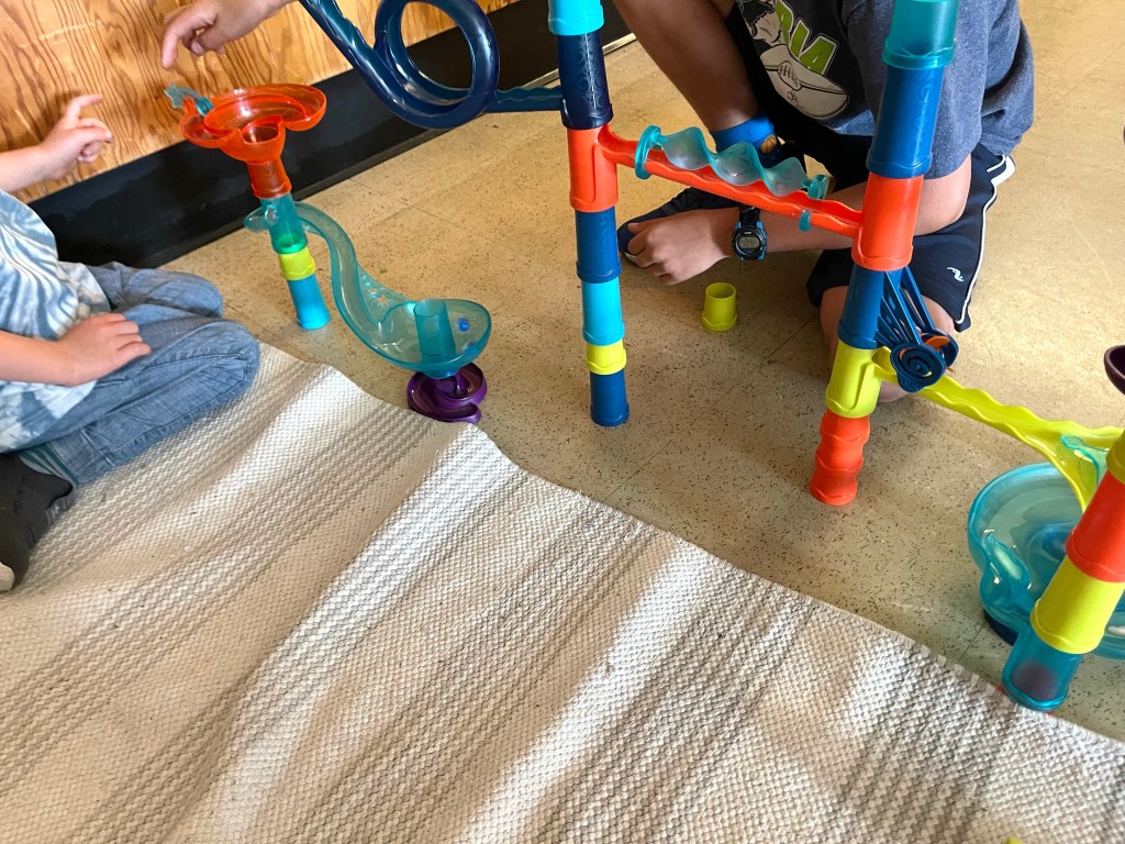Here are some photos of the hands-on, collaborative arts and sciences activities they shared today including building a marble run, KEVA plank engineering, drawing, Megablocks constructions, toy vehicles, Lego, Story Studio (loose parts play), reading, and more.