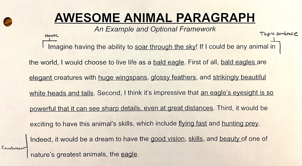 Then, we read an example of a paragraph I created about eagles. I pointed out the paragraph’s hook, topic sentence, use of transition words, development of three ideas, and conclusion. I showed how the conclusion summarizes the three ideas of the paragraph.