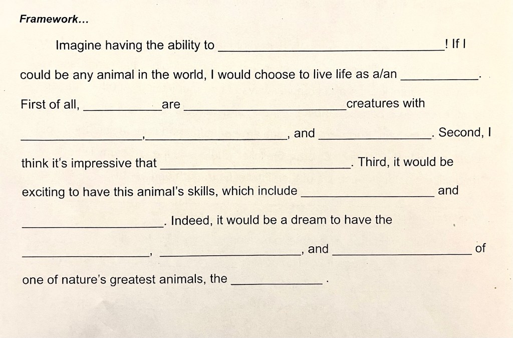 We then read and discussed three more examples of well-structured animal paragraphs, and I shared another fill-in-the-blank paragraph framework. See below.