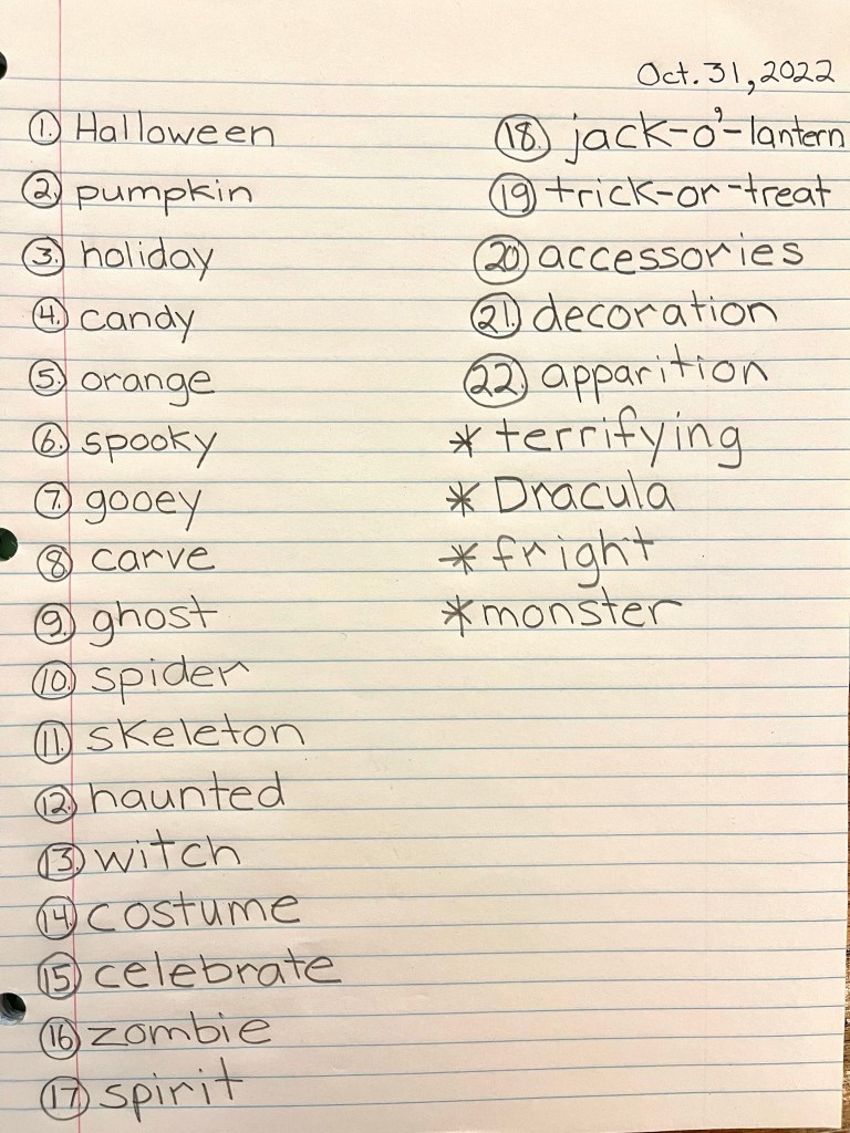 In Language Arts today, we reviewed the list of Halloween spelling words that the students had brainstormed together last week. Students have been using these words when writing Halloween-themed paragraphs and poems. We will have a Spelling quiz on Friday.