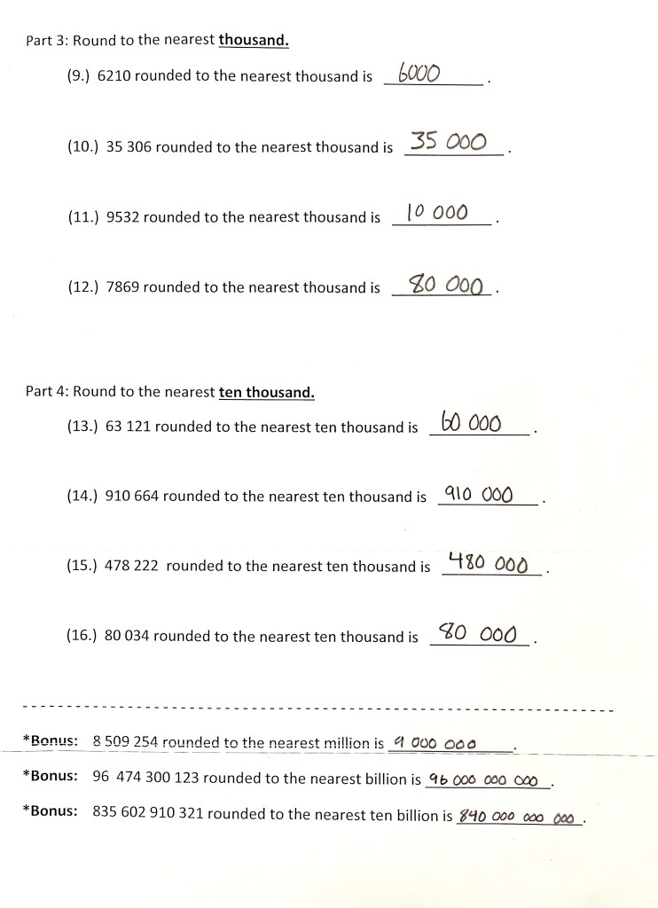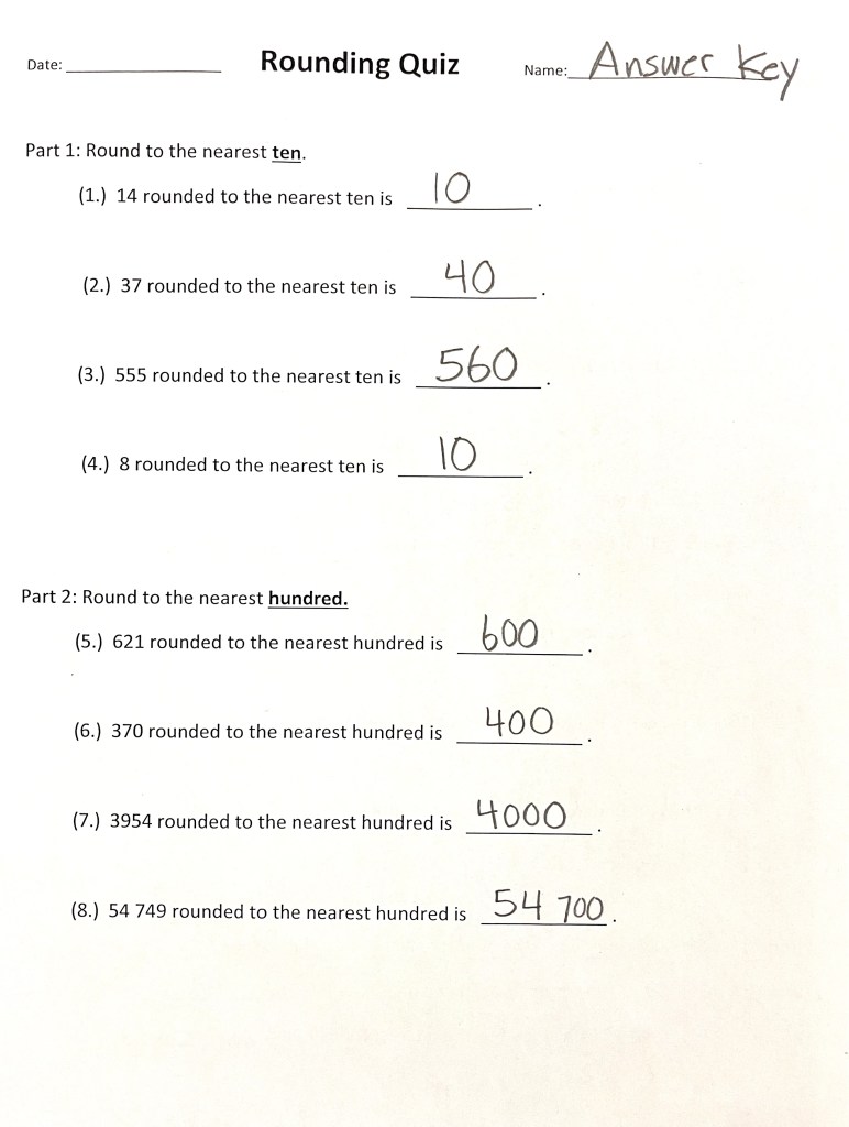 QUIZZES: This week, students wrapped up the Rounding unit in math, and they brought home their quizzes to share with their families. (See the answer key below.)