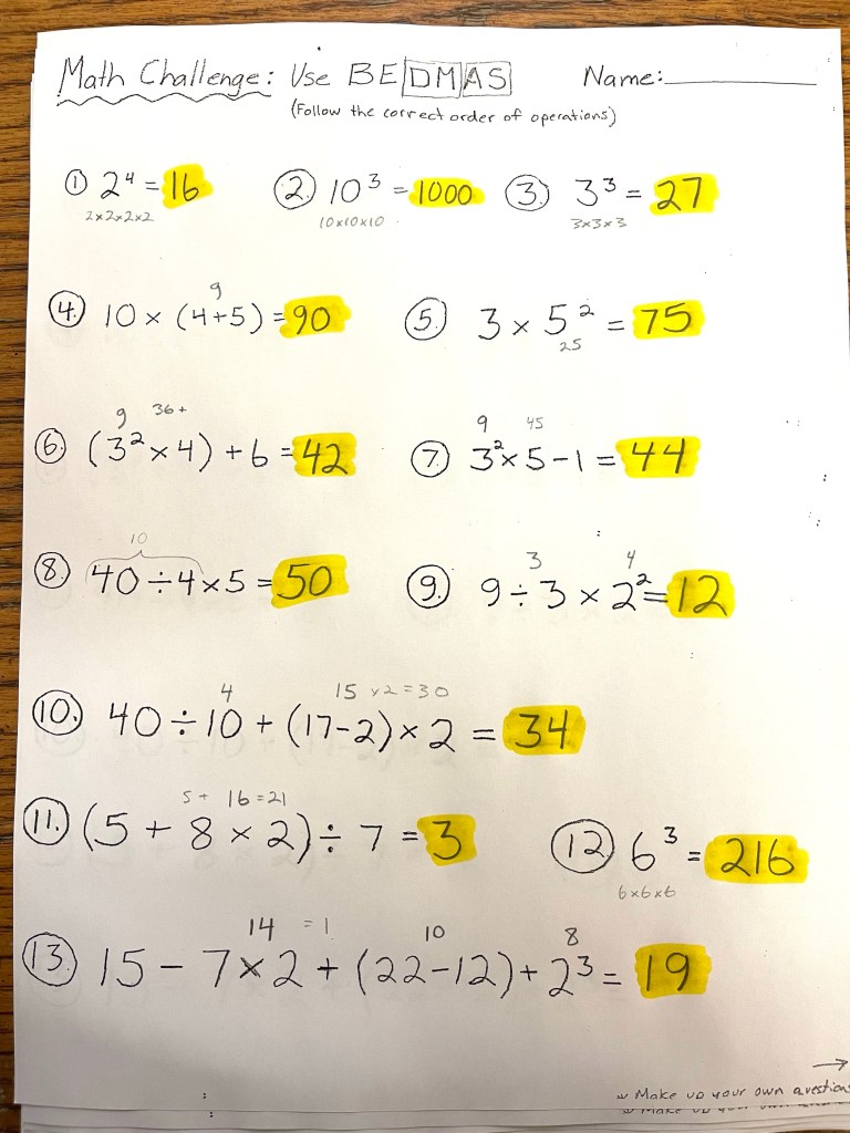 MATH ENRICHMENT: I invite all students who enjoy math to try “Math Challenge” sheets and explore our special collection of math games and books. Every math lesson is differentiated and personalized for students to cover (a.) any necessary review content from earlier grades, (b.) grade 4 and grade 5 curriculum targeted as needed, as well as (c.) higher order thinking provocations and math learning extensions. As well, this week in our “Sneak Peek at Middle School Math” activities, we centred learning on how to use exponents and follow the order of operations (BEDMAS). See the image below for a sample of the question types and see the videos below for a review of this advanced content.