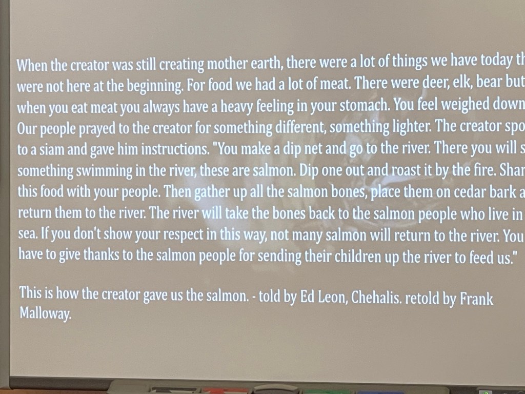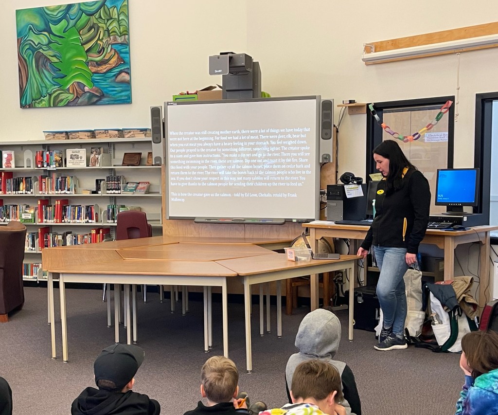 We are so excited that this coming Tuesday, February 7th is our Salish Sea adventure! This week we had Tom, Meaghan, and Crystelle from “Eagle Wing Tours” visit us to get us ready and get us even more excited for our trip! They shared lots of background and connections between scientific discoveries and local Indigenous knowledge.