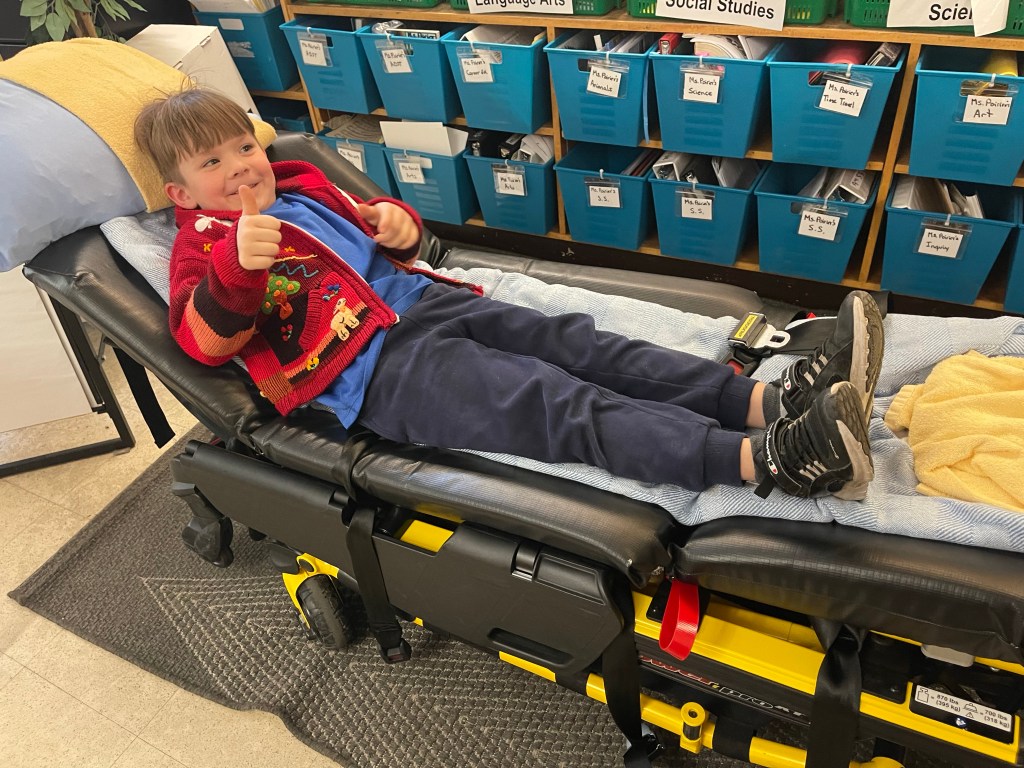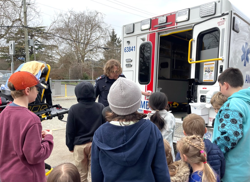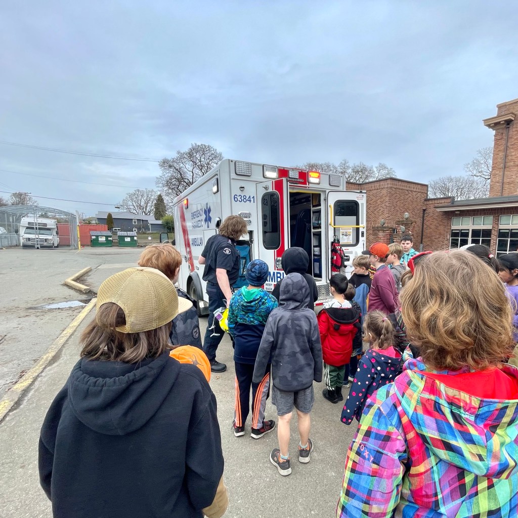 Today our grade 4/5 students joined up with our kindergarten buddies to enjoy a very special presentation by our classmate Leo’s dad, Eric. Eric is a paramedic and he drove over an ambulance to help us bring our career education and health and safety learning to life.