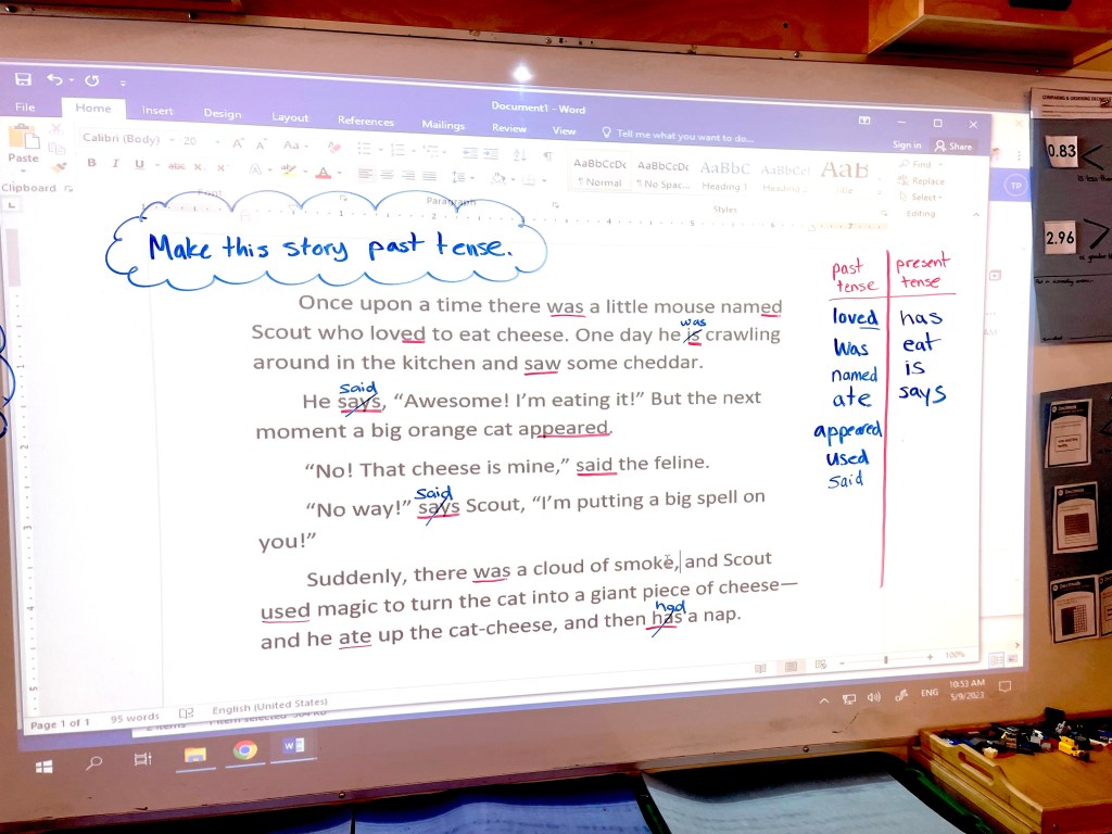 In Language Arts we had a lesson to learn to identify the difference between text that is written in past tense versus the present tense.