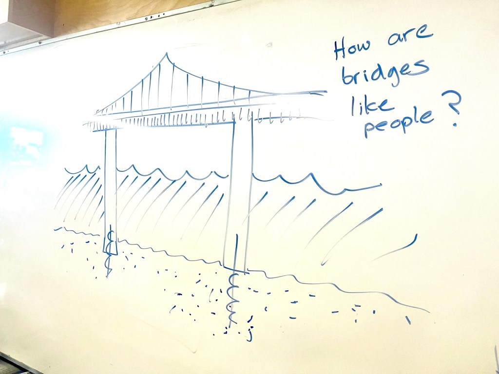 Students also made their own creative metaphorical connections between humans and bridges in our creative dialogue during Language Arts.