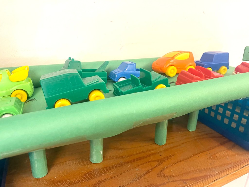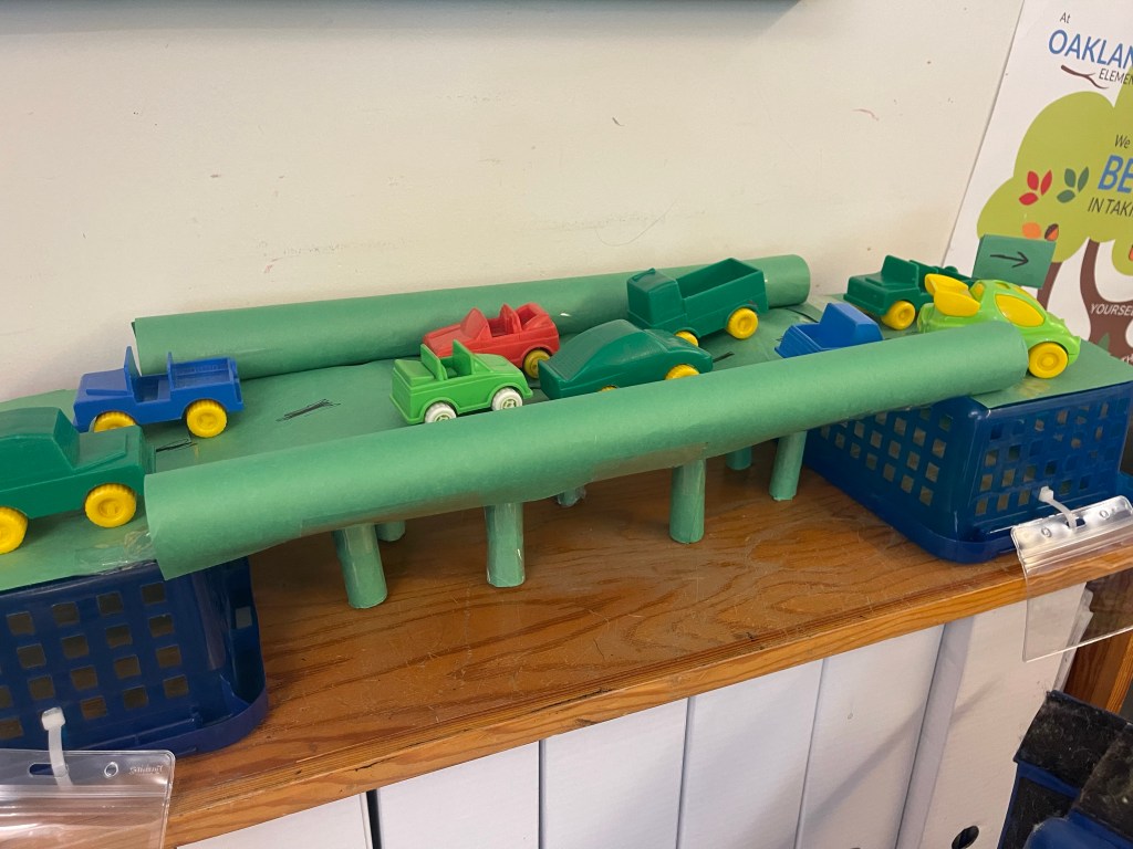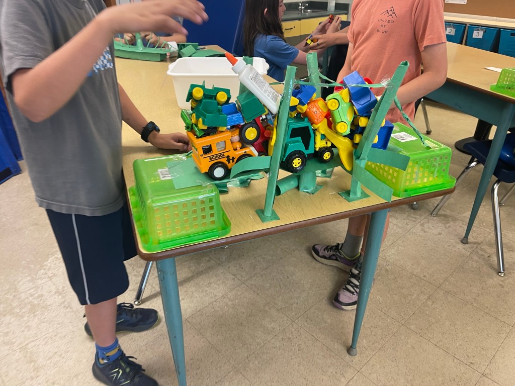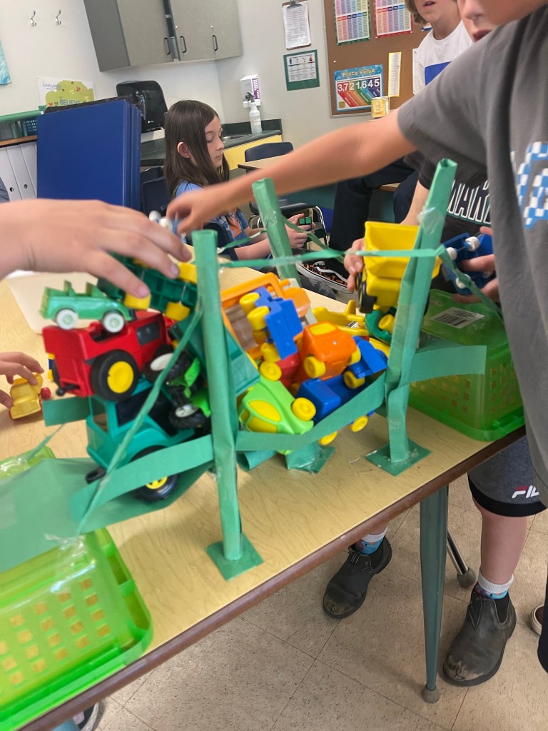 During our construction bridge design challenge with a set quality of materials, students have been testing their own theories about what shapes and structures and will lend more strength. They are building their own model bridges to support as much weight as possible without collapsing or buckling when various toy cars are placed on top.