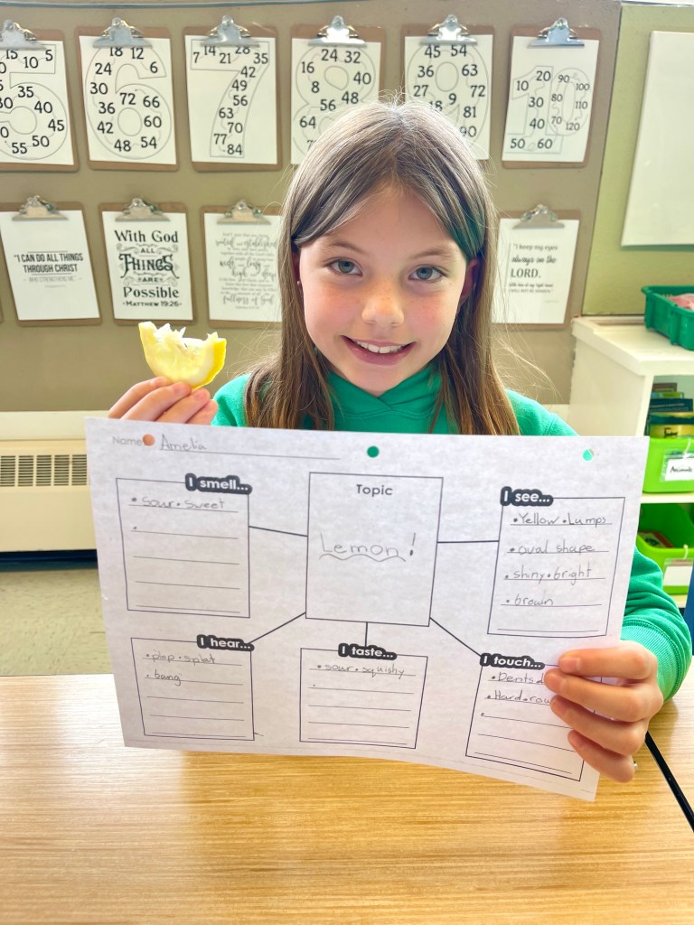 In Science class, we continued our focus on the five senses with an inquiry into the properties of lemons. Students were encouraged to discuss and compare their findings and record their sense data again on a mindmap template. We sure had some giggles making sour faces!