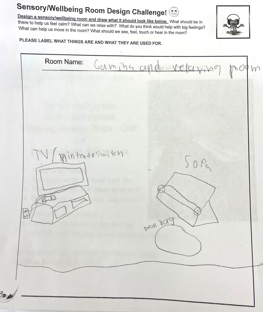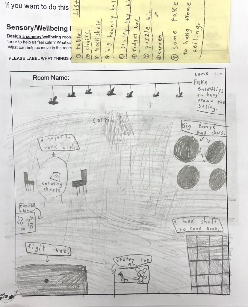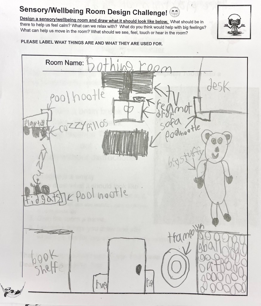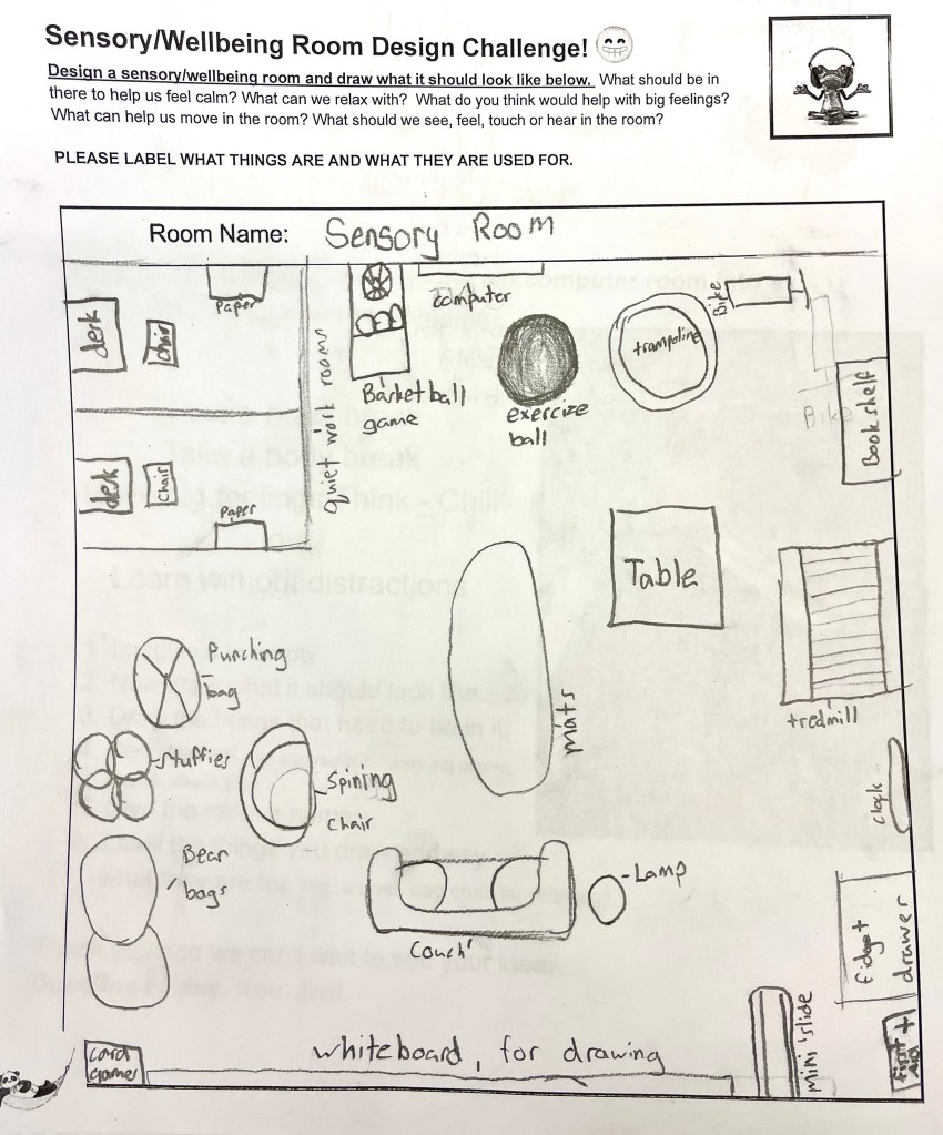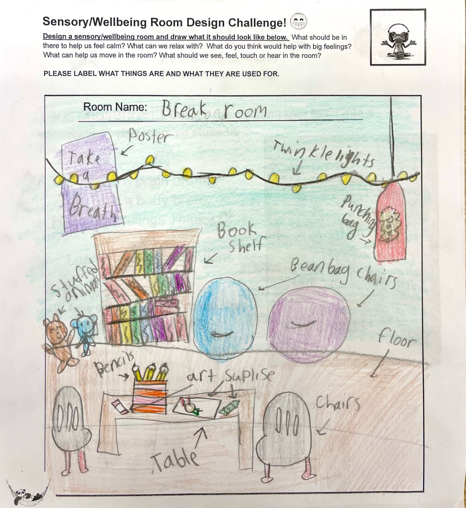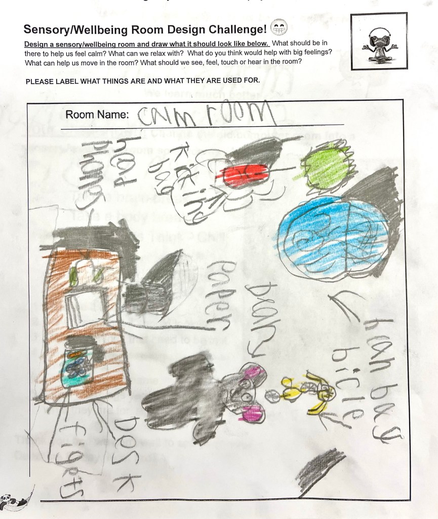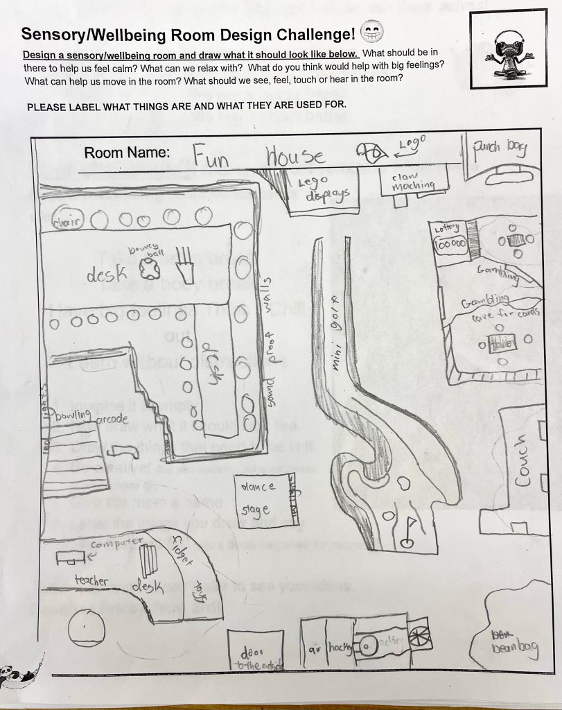 In Health Ed. this week, Mrs. Murphy has us thinking about what steps we can take to regulate our emotions and energy. She invited students into a creative challenge of designing plans for a new “sensory room” for our school. It was valuable learning time to reflect upon what environmental elements and tools can help us to re-focus.