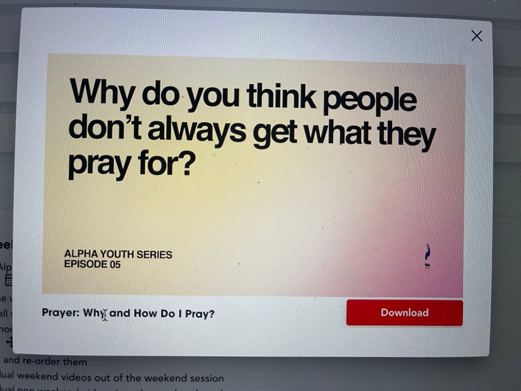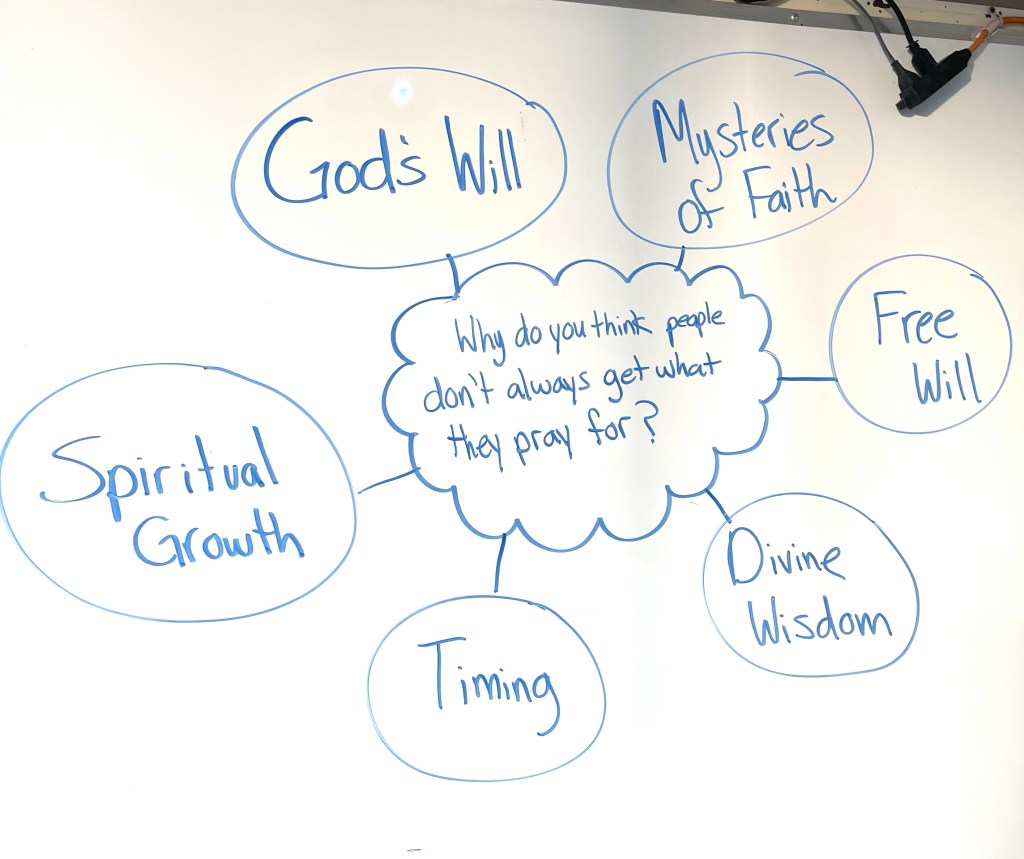 In Religion class today, we have been seeking to deepen our prayer practice. We returned to some “Alpha Course” content with the lesson titled “Prayer: Why and How Do I Pray?” Students were very thoughtful in using a Catholic lens as well as their own ideas to consider possible answers to this “Why do you think people don’t always get what they pray for?”