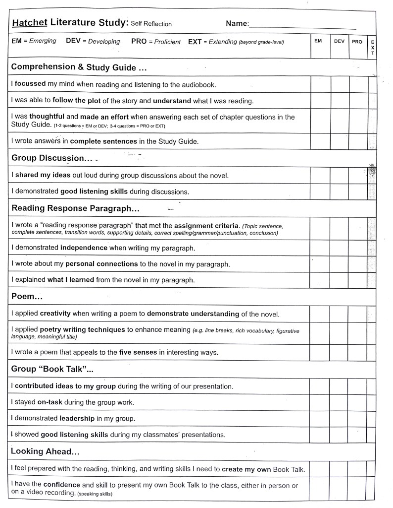 In addition to this ongoing study guide work, after we complete the last chapter of Hatchet, students will demonstrate their depth of understanding of the novel through writing a reading response paragraph (a criteria sheet and template will be provided). As well, students will be writing a poem inspired by the novel and then work with a small group to create and present a “book talk” about it.