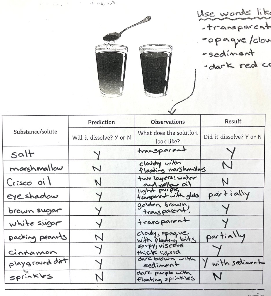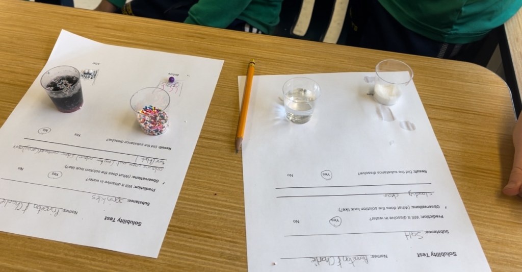 In Science we had an exciting day of applying the scientific method when doing solubility experiments. The photos of our handouts, class work, and experiments help tell the story of our learning. We will continue to explore water-related experiments in Science class—next time we look at the salinity of the ocean and how much salt can be dissolved in a given volume of water.