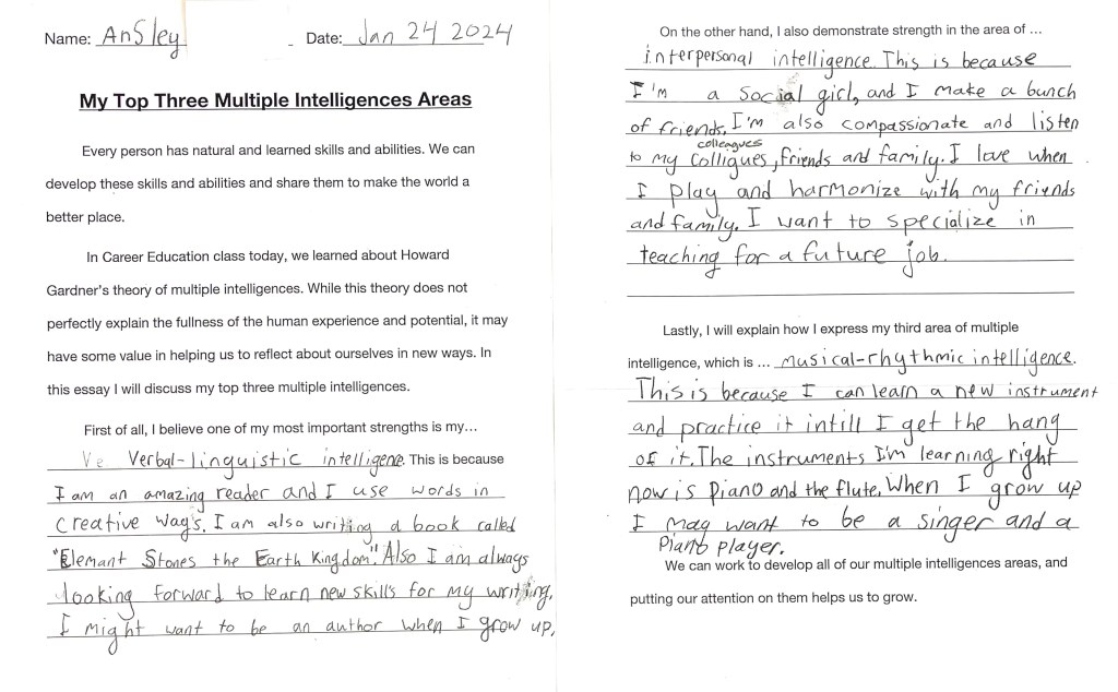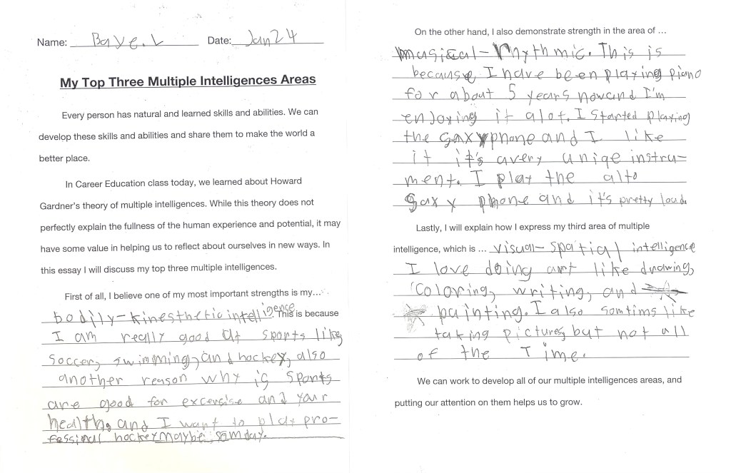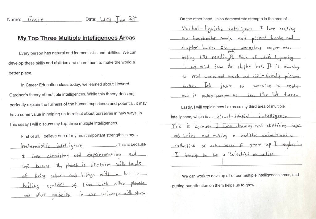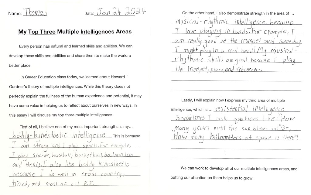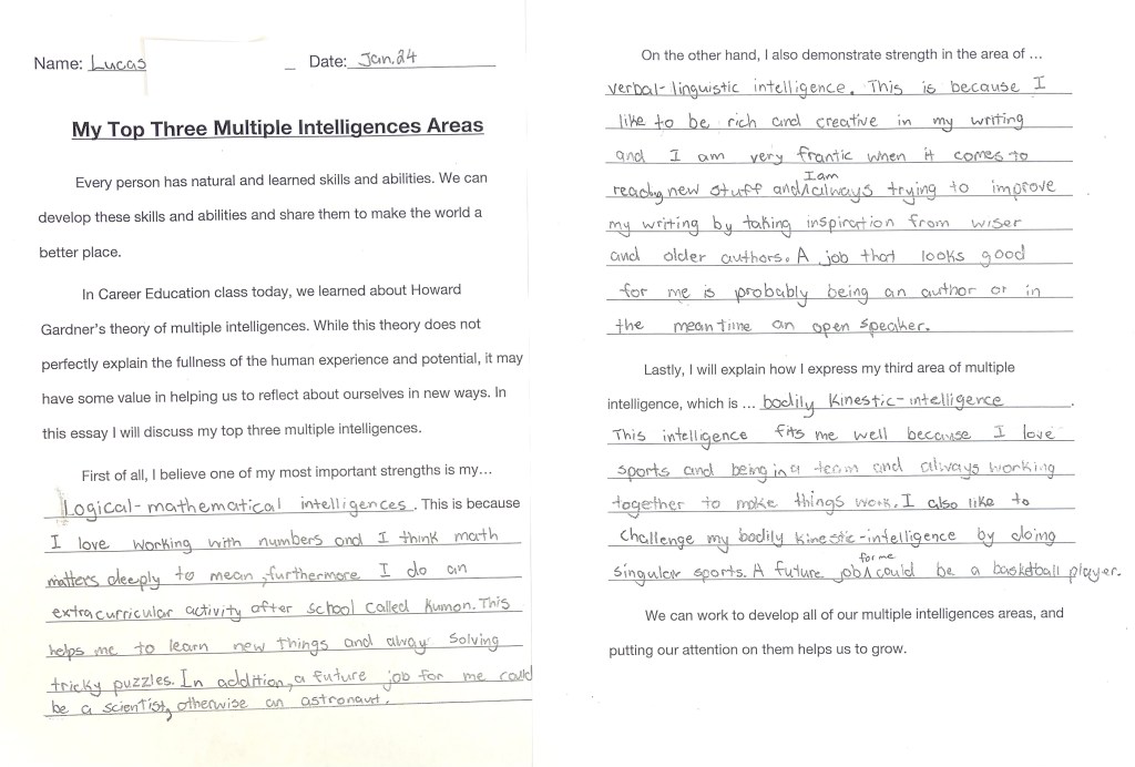 After we discussed examples and made personal connections to ideas of the M.I. theory, students wrote reflective essays using a provided template. We invite you to enjoy the wonderful essays below (all of which were volunteered to be shared on the blog).