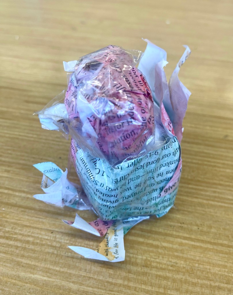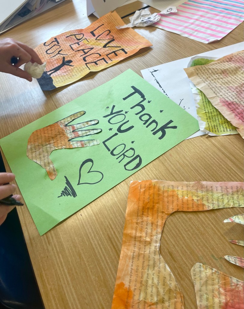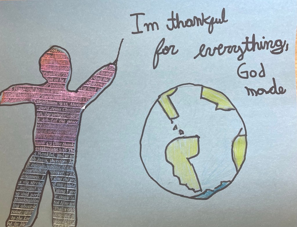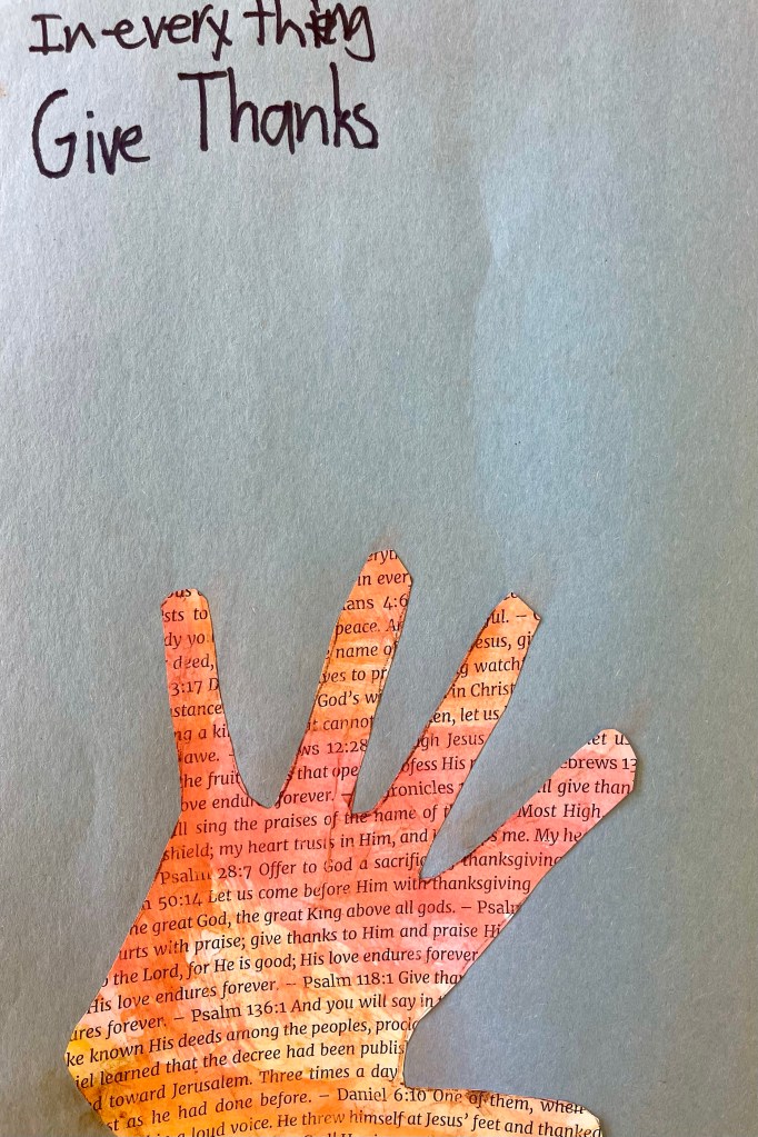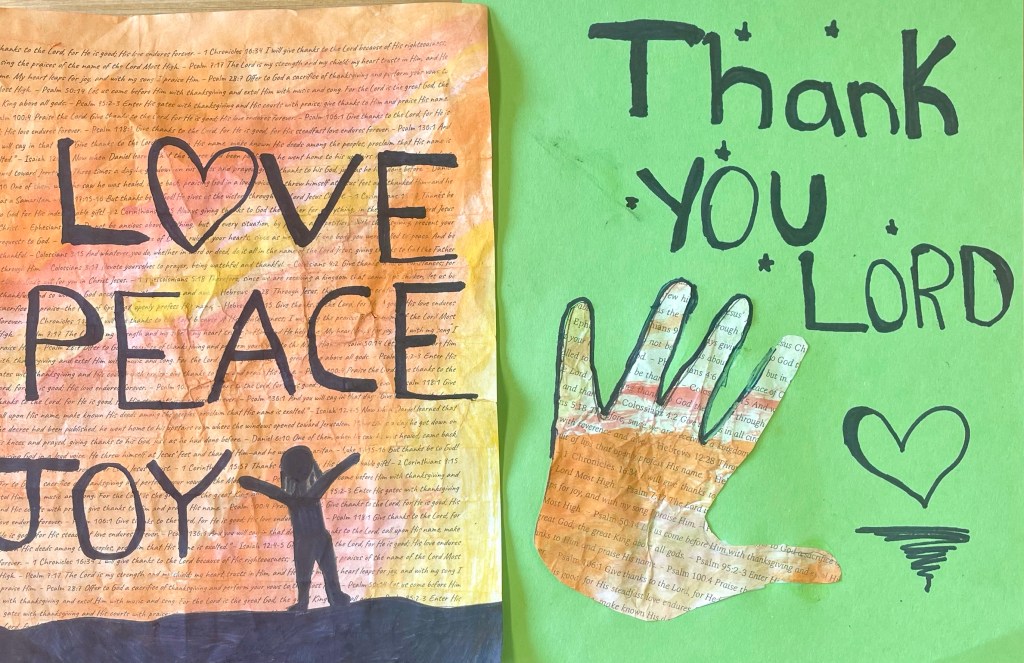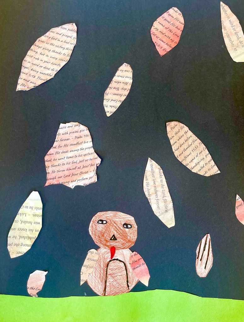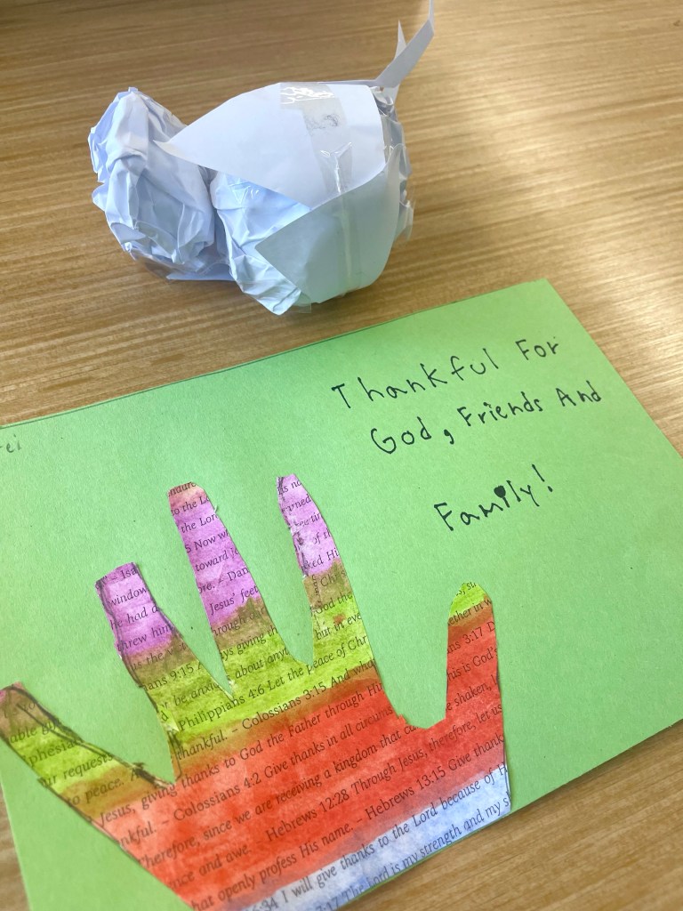 Our open-ended creative challenge for students on Friday was to make any kind of 2D or 3D Thanksgiving art they like by meaningfully using and/or transforming papers printed with a collection of Bible verses on the theme of gratitude, thanks, and appreciation for God and His creation.
