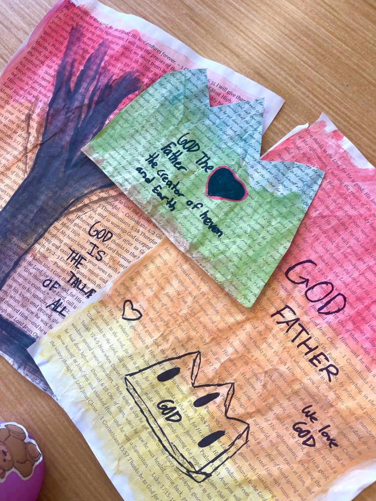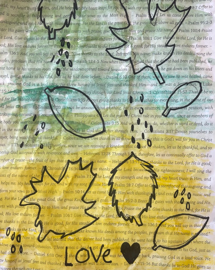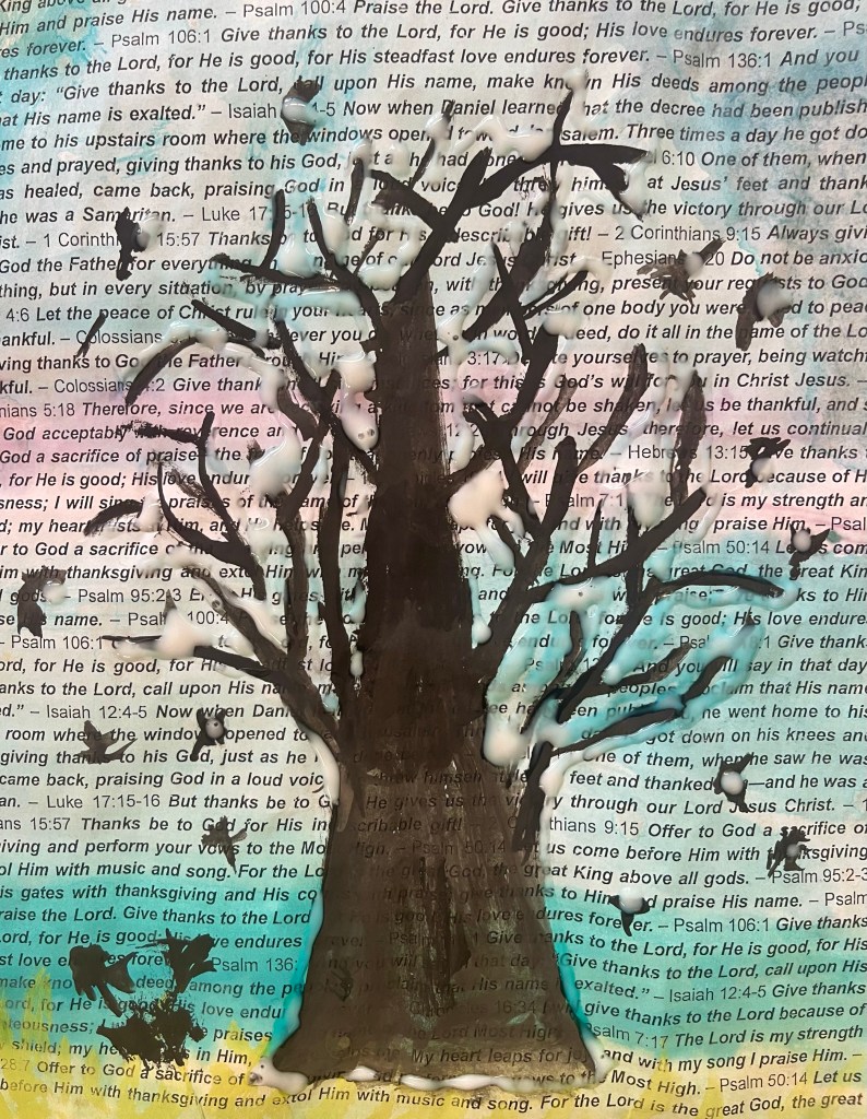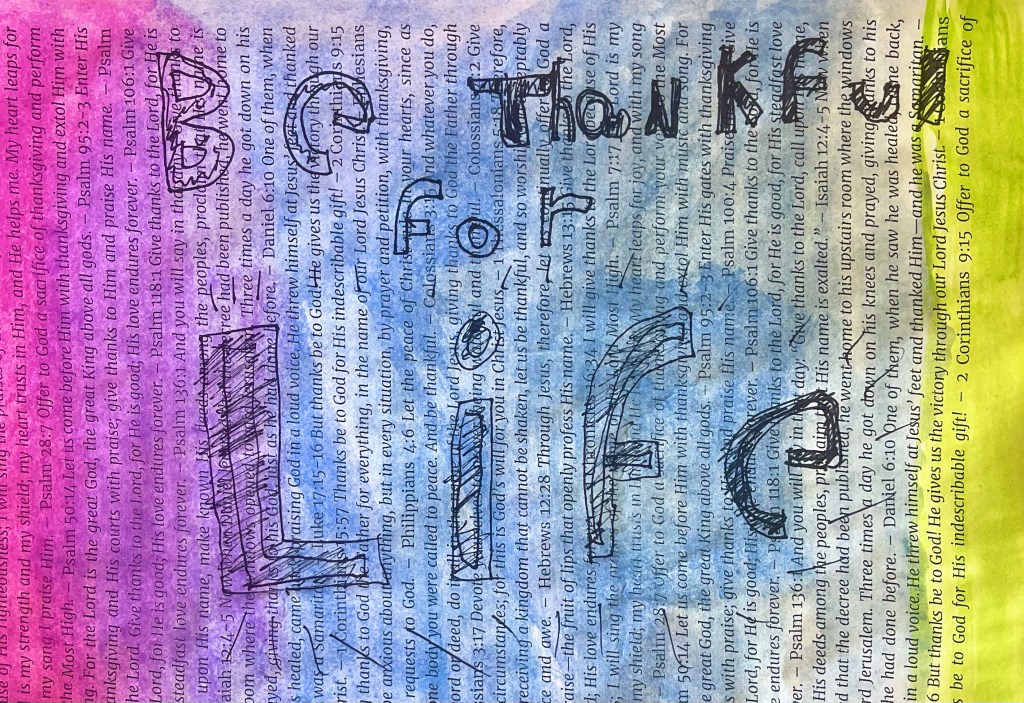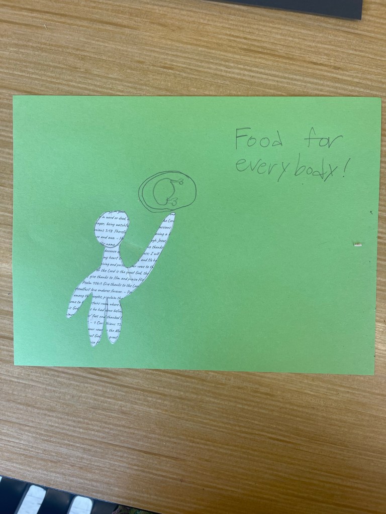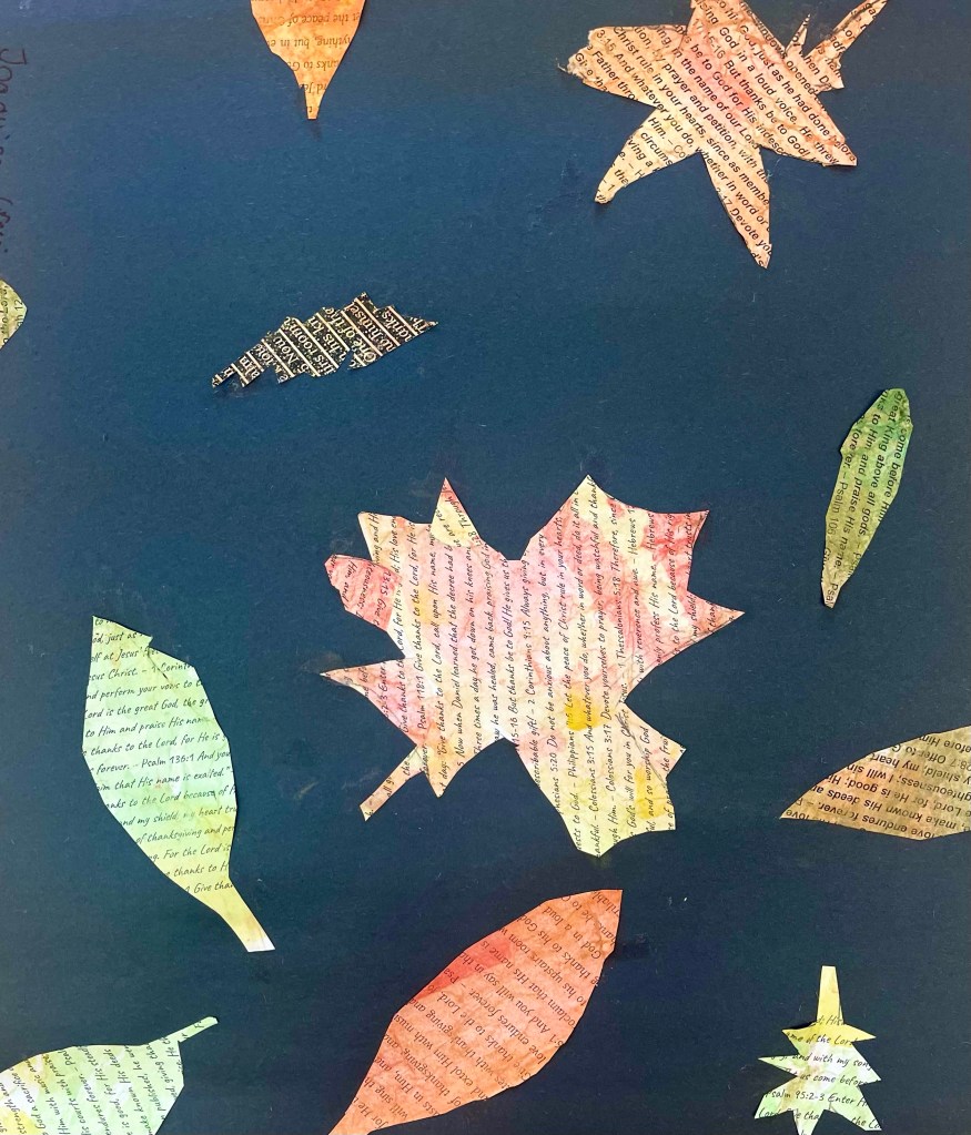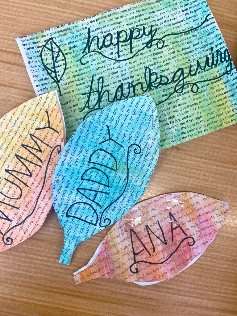 Our open-ended creative challenge for students on Friday was to make any kind of 2D or 3D Thanksgiving art they like by meaningfully using and/or transforming papers printed with a collection of Bible verses on the theme of gratitude, thanks, and appreciation for God and His creation.
