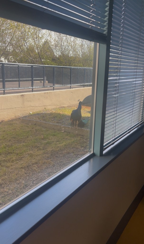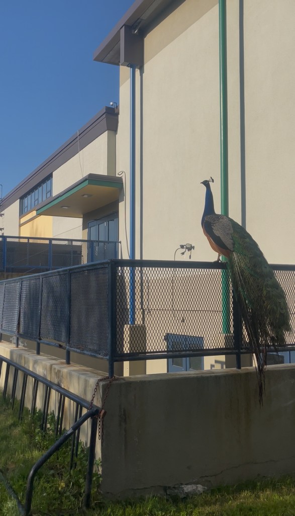 Could this be another new mascot? This curious and confident fellow was snooping around the school grounds yesterday, spying in the windows and perhaps looking for his Mrs. Peacock. We wondered if he was drawn in by the school’s pillars painted bright blue and green—just like him. Or did all of the students in green uniform seem like a friendly new flock to join? We wondered about his backstory and reasons for exploring beyond his territory. A great creative writing prompt! What do you think is this fellow’s story? Where will he go next?