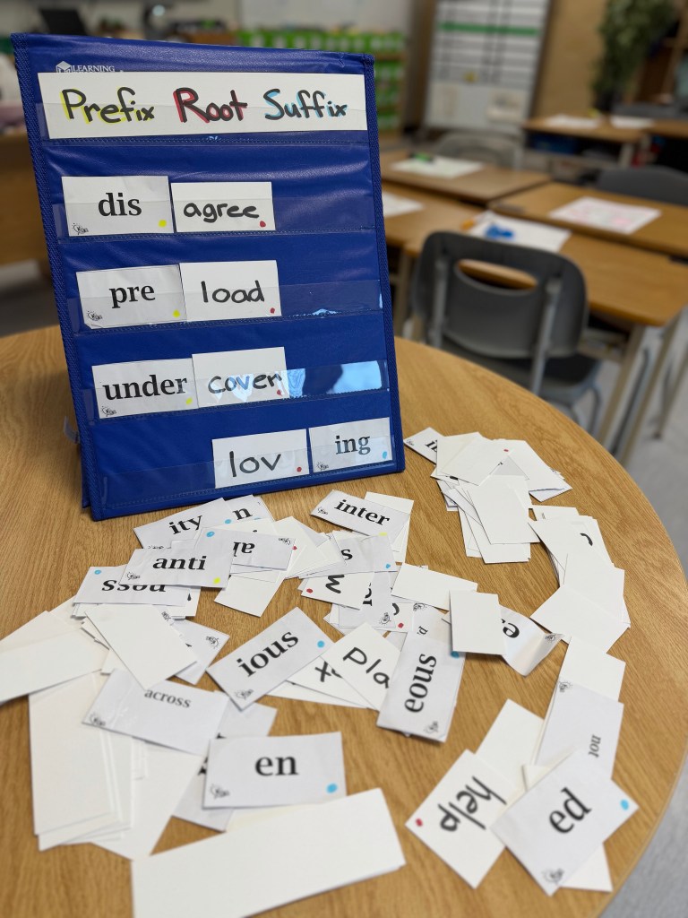 In class, students are also exploring two prefix and suffix literacy centres to help them practice these ideas in a hands-on way.