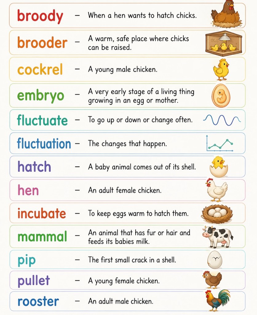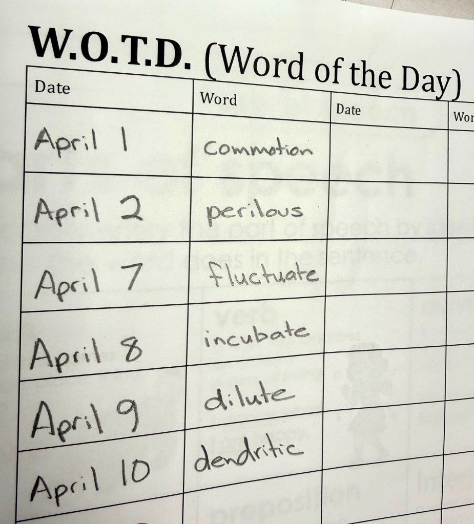W.O.T.D (Word of the Day): Each day in our class we focus on learning a challenging new vocabulary word—we choose a word that naturally emerges in our learning. For example, on April 1st there was quite a commotion in the school after an April Fool’s prank was played. On April 7th we talked about how the egg incubator’s humidity can fluctuate. On April 9th we learned about how to dilute paint with water to create more subtle tones. On April 10th, we focussed our attention on the dendritic way watercolour paint can spread out through the page—looking like the dendritic roots or branches of a tree or veins. Ask you child to explain and use any of the above words meaningfully in a sentence.