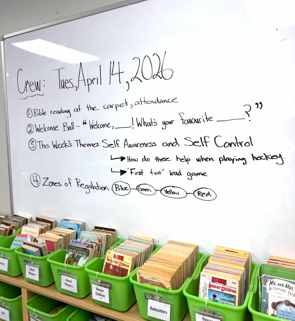 Then students go around sharing either a verse or insight from that reading time. We pray, share intentions, play “Welcome Ball”, unpack the theme(s) of the week (this week’s was self awareness and self control) and either have a related story or creative/cooperative activity to help get our team working together.