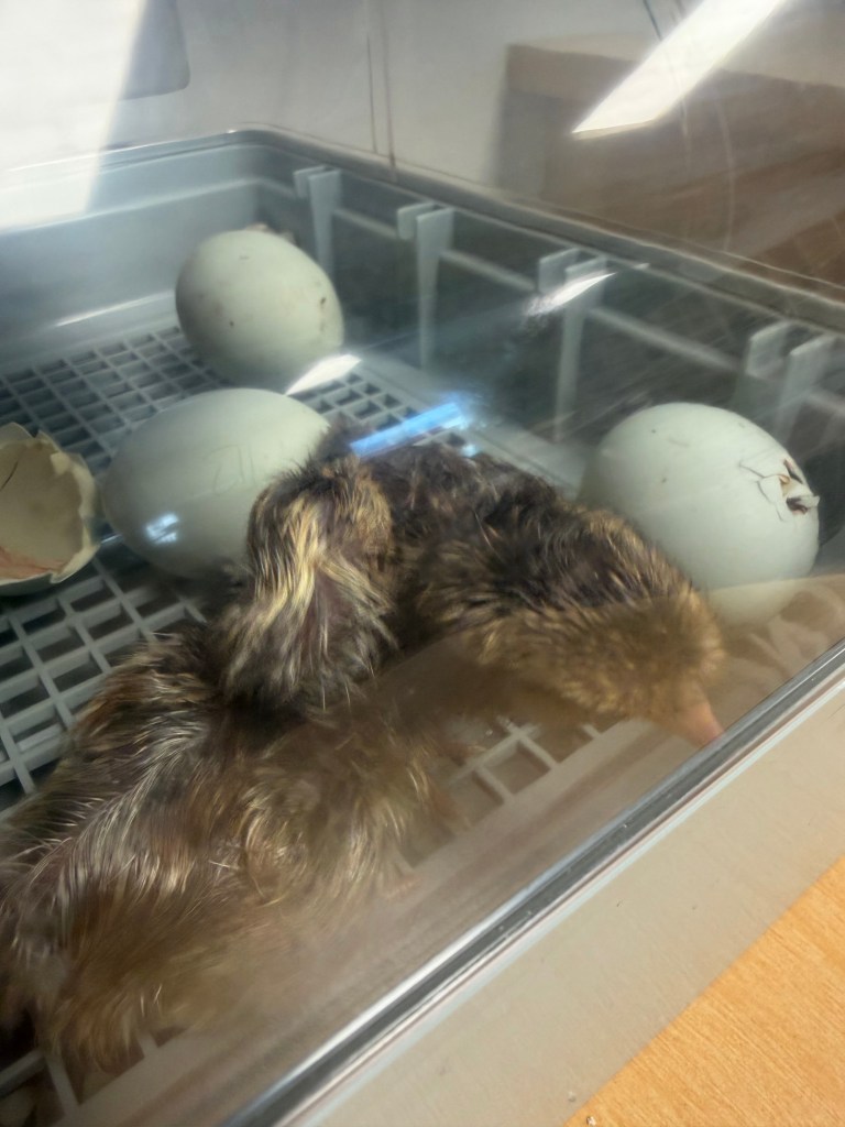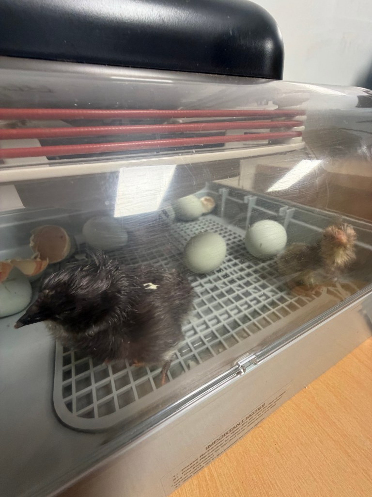 The first chick hatched about an hour before we even arrived at school, greeting th excited students. It was a tiny black one with a few white spots on her wing tips and chest (a cross between a Black Copper Maran and a Cream Legbar). If she is a hen, she will one day lay soft green eggs.