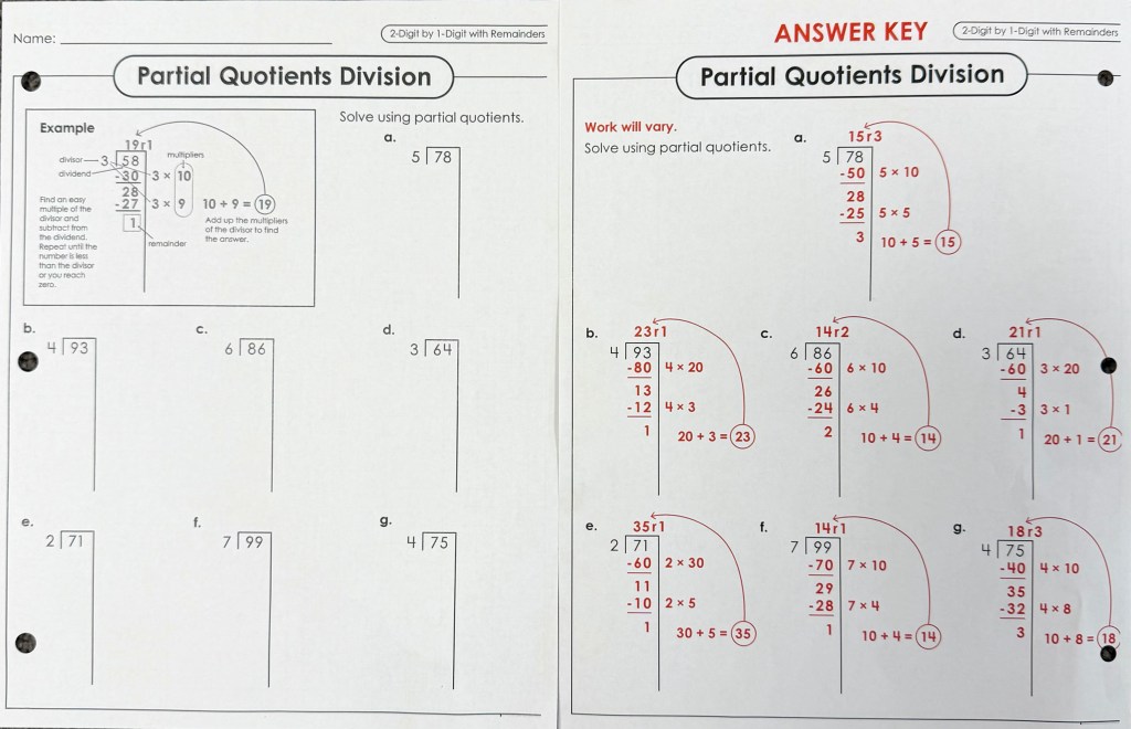 However, we started with “Partial Quotients” because it is more flexible and far easier for students with minimal division experience and who do not have the whole multiplication table memorized.