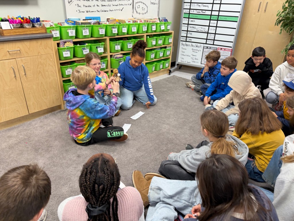 We have read, analyzed and discussed the parable of the good Samaritan, the parable of the unmerciful servant and the story of Jesus welcoming the children—and sought to connect these stories to our studies of how to meaningfully respond to racism. Students created more related puppet shows for us to reflect upon.