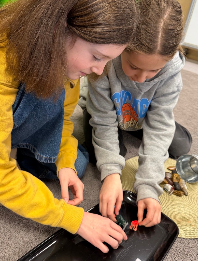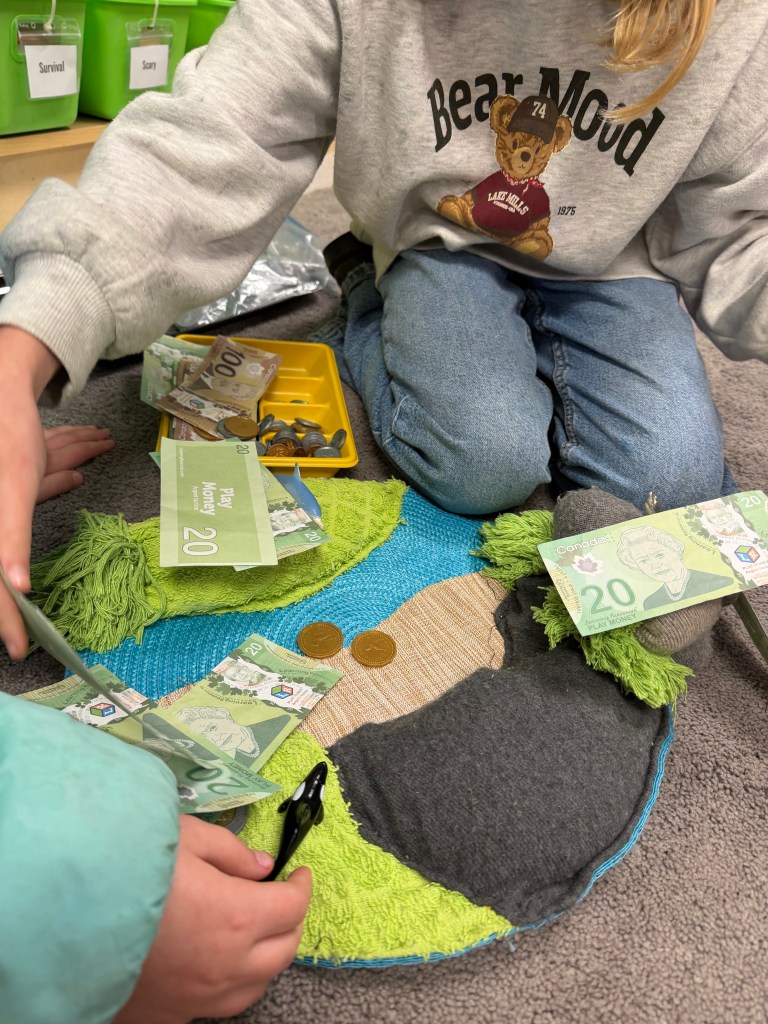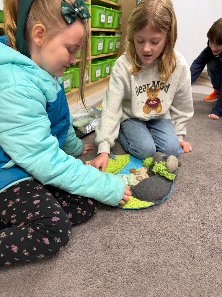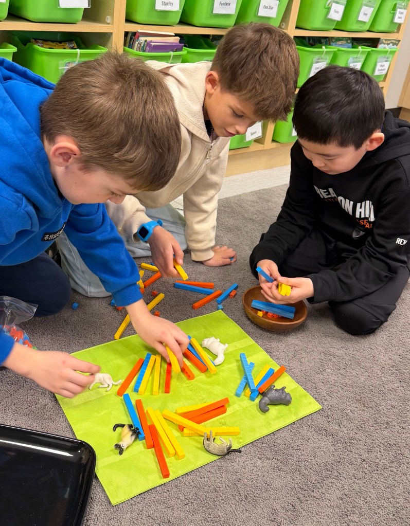 Students have been creating division math stories, working at times with maximum freedom of choice of materials and math topics. At other times, I challenge students to work within constraints from a teacher-curated prop list with defined questions.