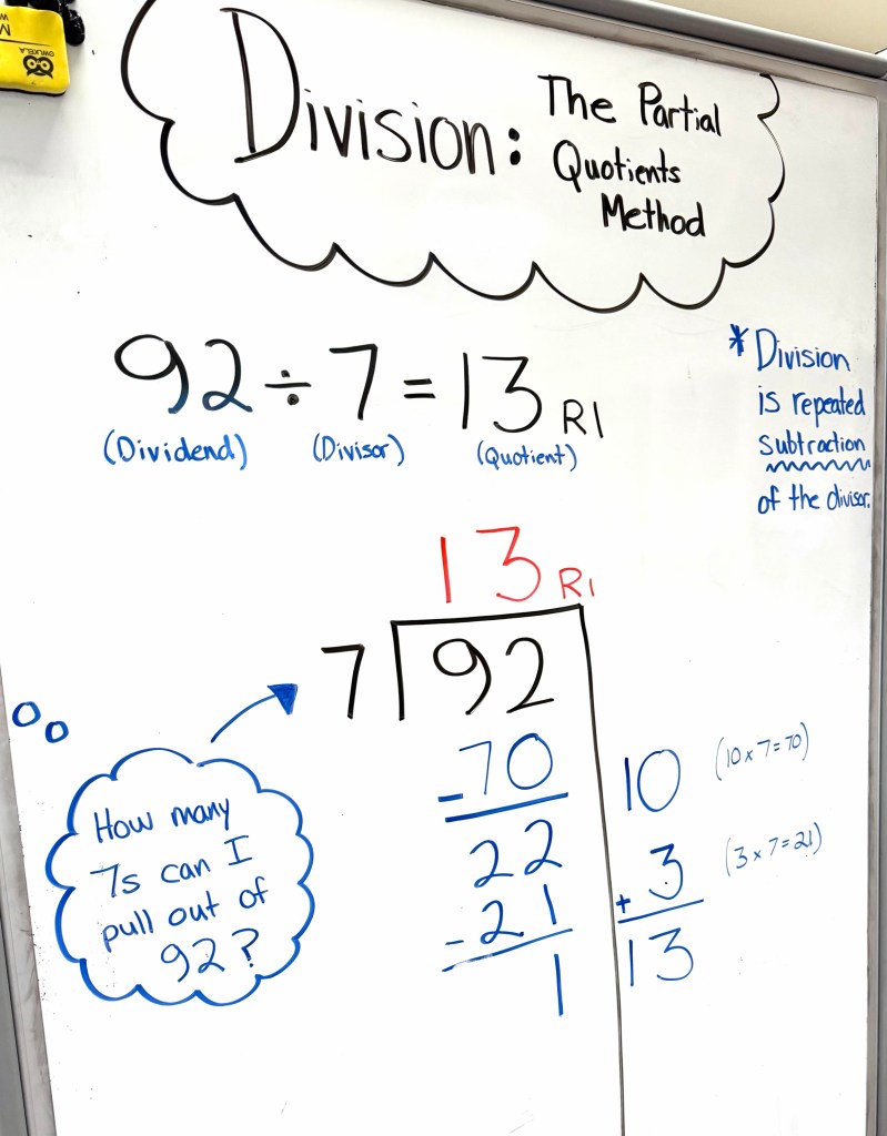However, we started with “Partial Quotients” because it is more flexible and far easier for students with minimal division experience and who do not have the whole multiplication table memorized.