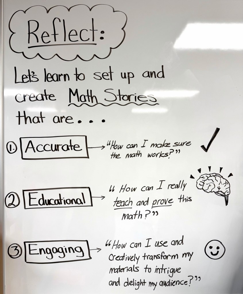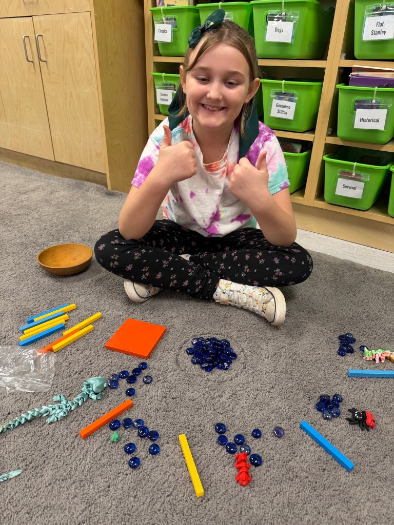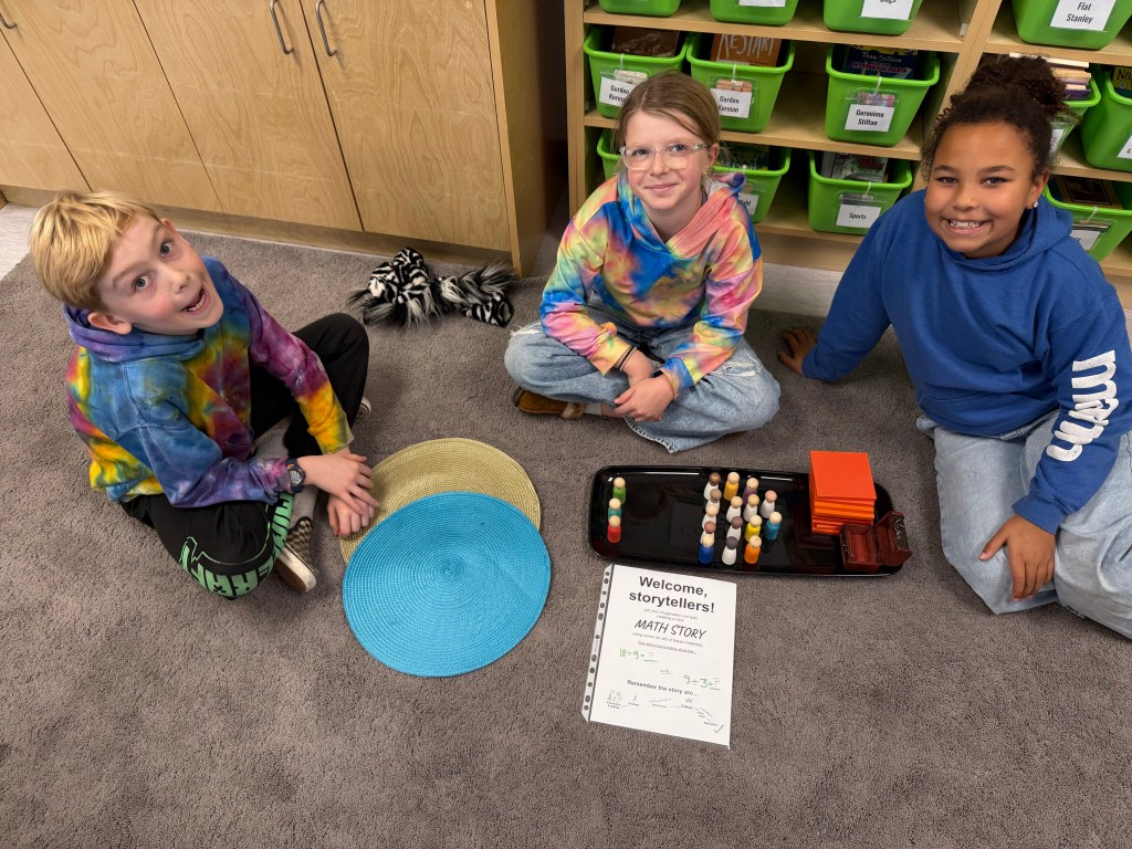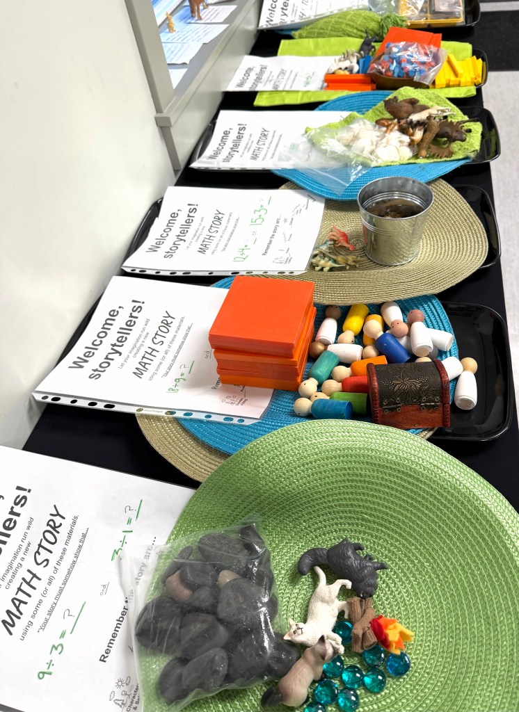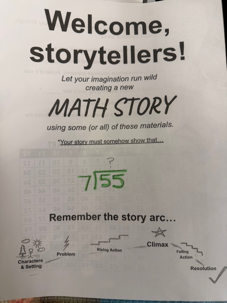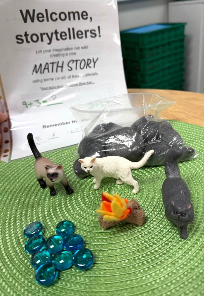 Students have been creating division math stories, working at times with maximum freedom of choice of materials and math topics. At other times, I challenge students to work within constraints from a teacher-curated prop list with defined questions.
