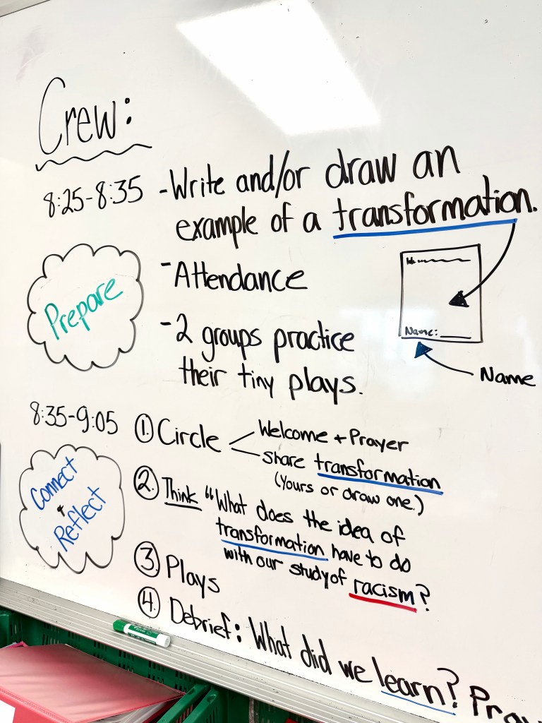 Next week, we focus in Crew (and throughout the curriculum) on the concept of “transformation”—so today we soft-launched that topic with a brainstorm so students can have time to beginning noticing transformations in our world.