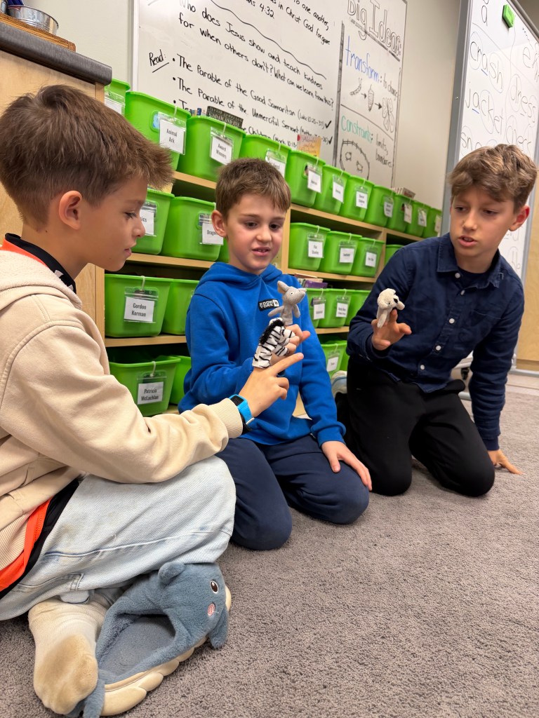 We have read, analyzed and discussed the parable of the good Samaritan, the parable of the unmerciful servant and the story of Jesus welcoming the children—and sought to connect these stories to our studies of how to meaningfully respond to racism. Students created more related puppet shows for us to reflect upon.