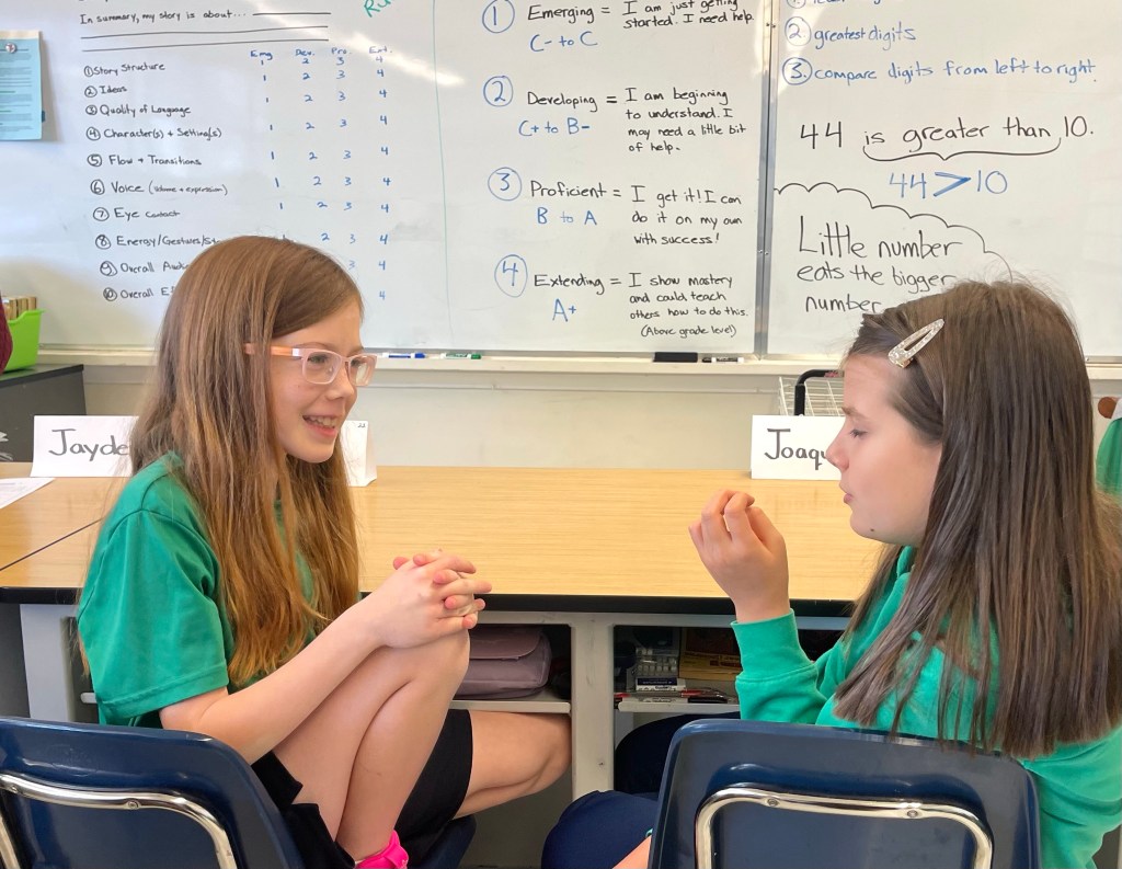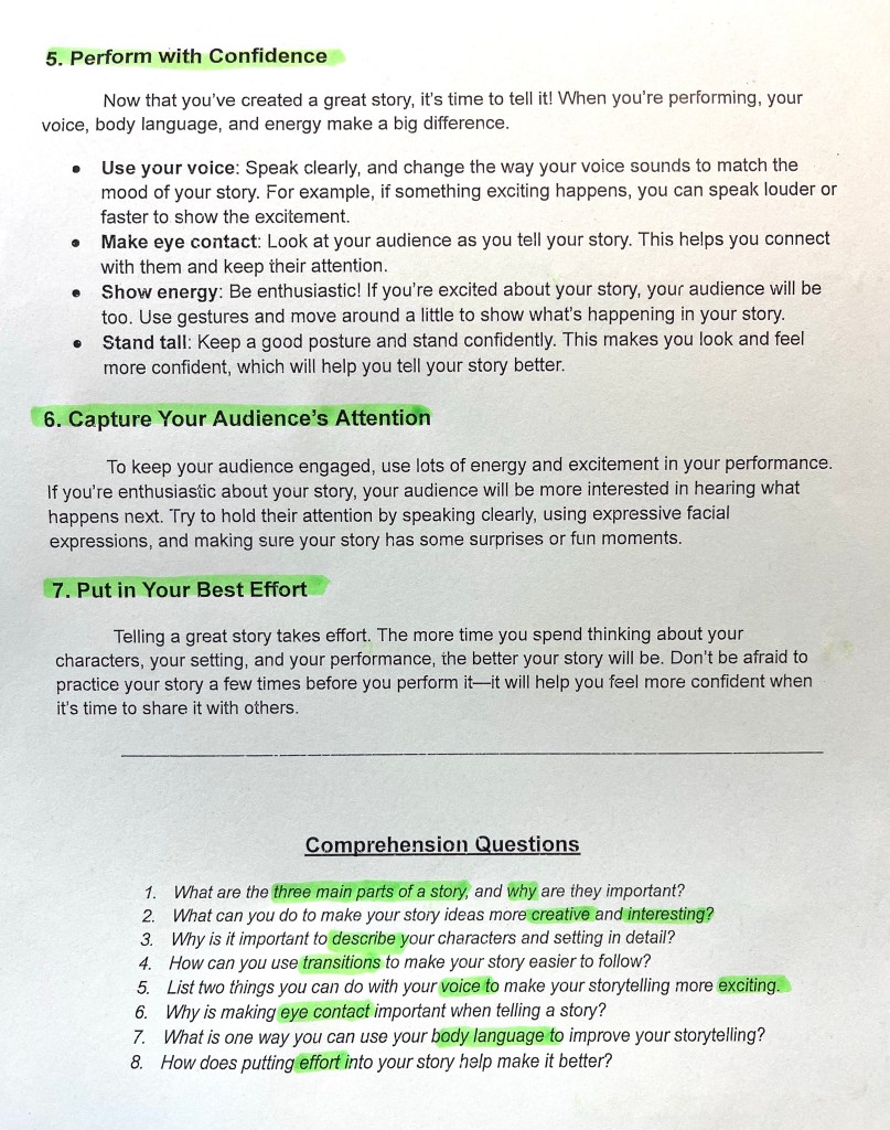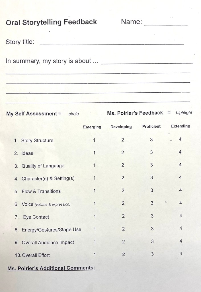 Students have had weekly practice sharing their original stories (either from memory or made up on the spot). They have and practiced giving and gracefully receiving helpful feedback peer feedback.