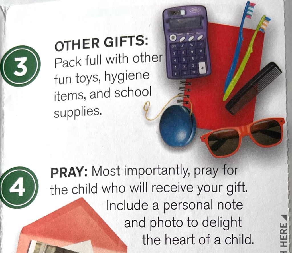 Please remember that shoeboxes cannot include liquids, used or breakable items, food, candy, medications, or war-related items.