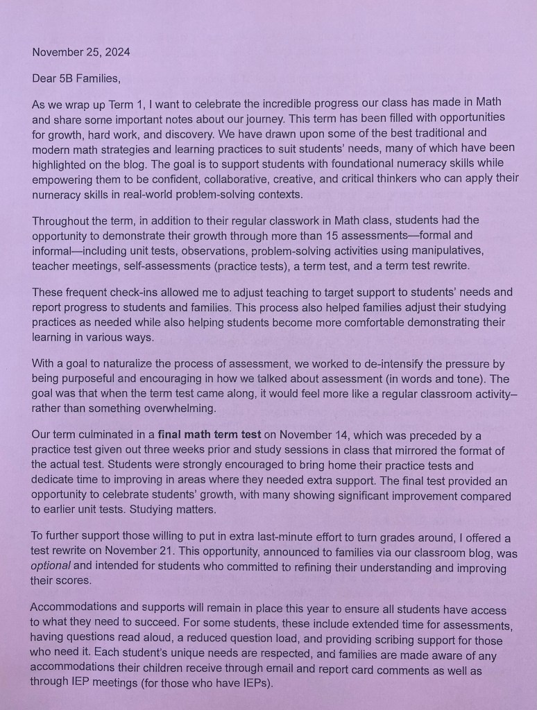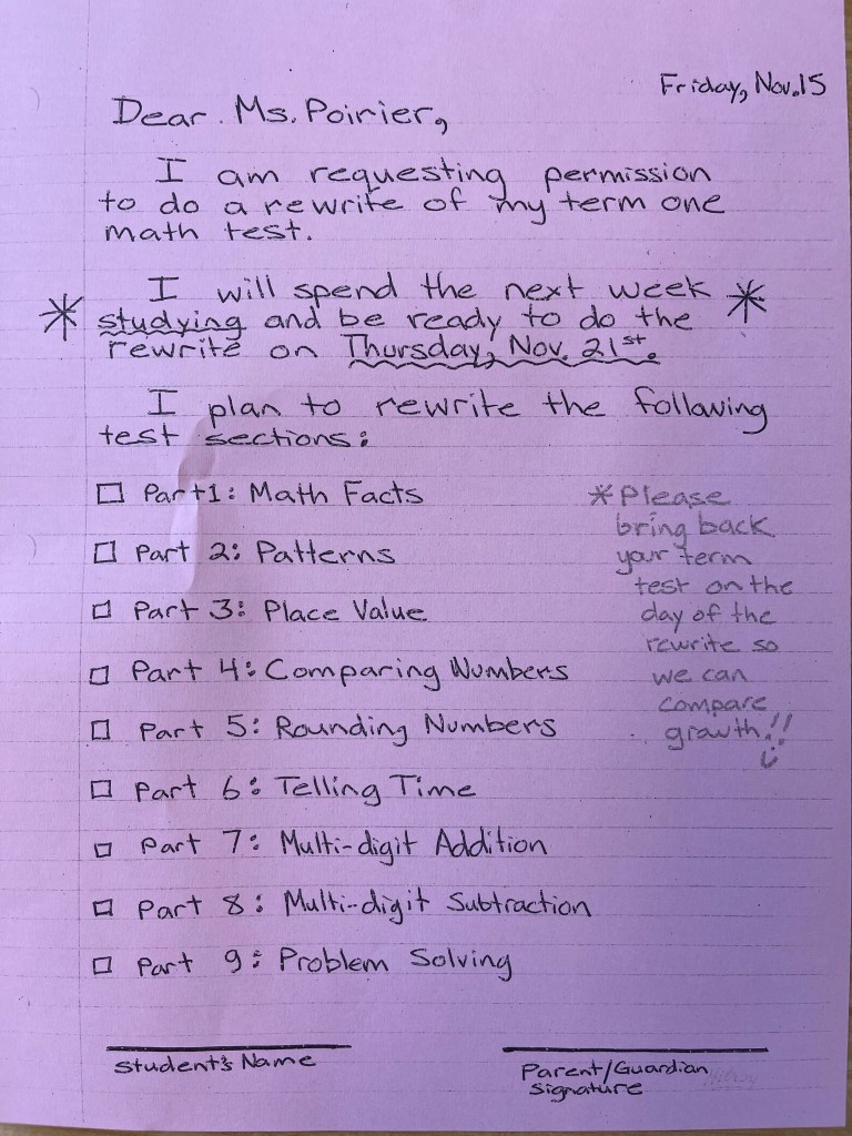 To further support student success, I am offering an optional Term 1 Math Test Rewrite on Thursday, November 21st. This is a firm deadline as I need time to mark and then recalculate and change grades (if warranted) to submit to the office the following week. The rewrite provides an opportunity for students to improve their grade if they have demonstrated growth—the rewrite would not lower a grade.