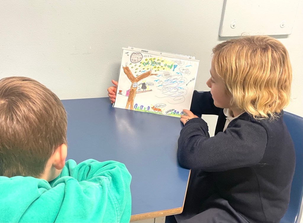 This term, students have learned concepts and practiced skills to grow as oral storytellers while crafting their own original narratives to share and inspire others in our school community. This valuable life skill builds confidence and creativity, and lays a stronger foundation for core literacy skills. Emphasis on the development of quality ideas over worrying about the mechanics of recording them with a pencil or keyboard removes barriers and fosters inclusion, while at the same time providing a motivation for students to capture their great work by developing those writing skills alongside. Even with the permission that, “you don’t have to write this story down,” many pages were written voluntarily as students took ownership and wanted to fine-tune their tales at the word-by-word written level.
