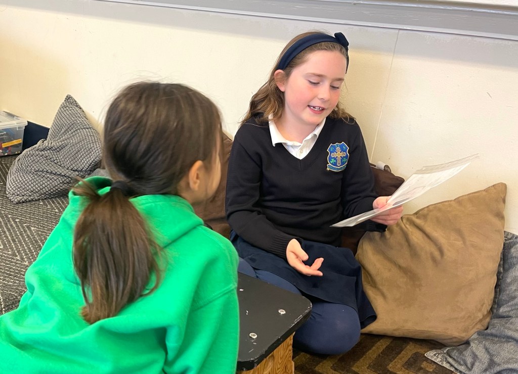 Sara tells “The Orca Who Came to Swimming Lessons” to Ben from the grade 2 class.