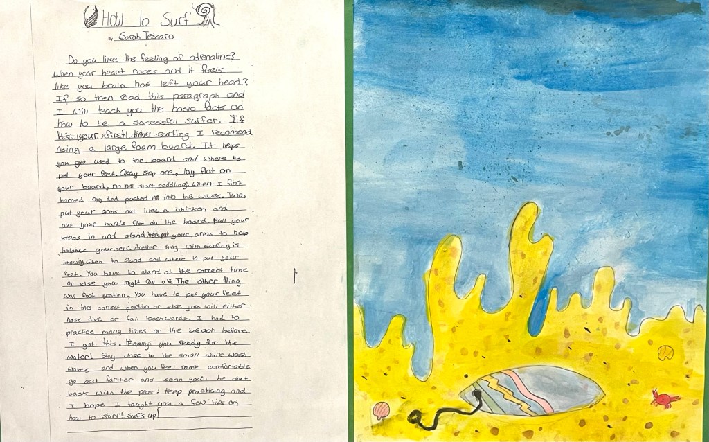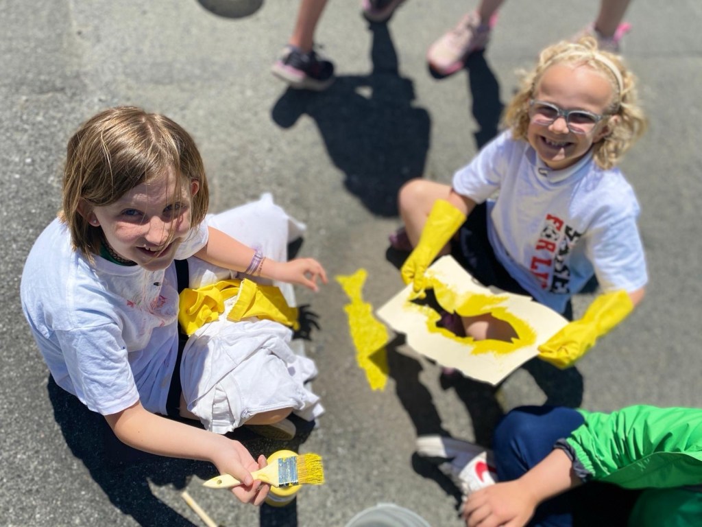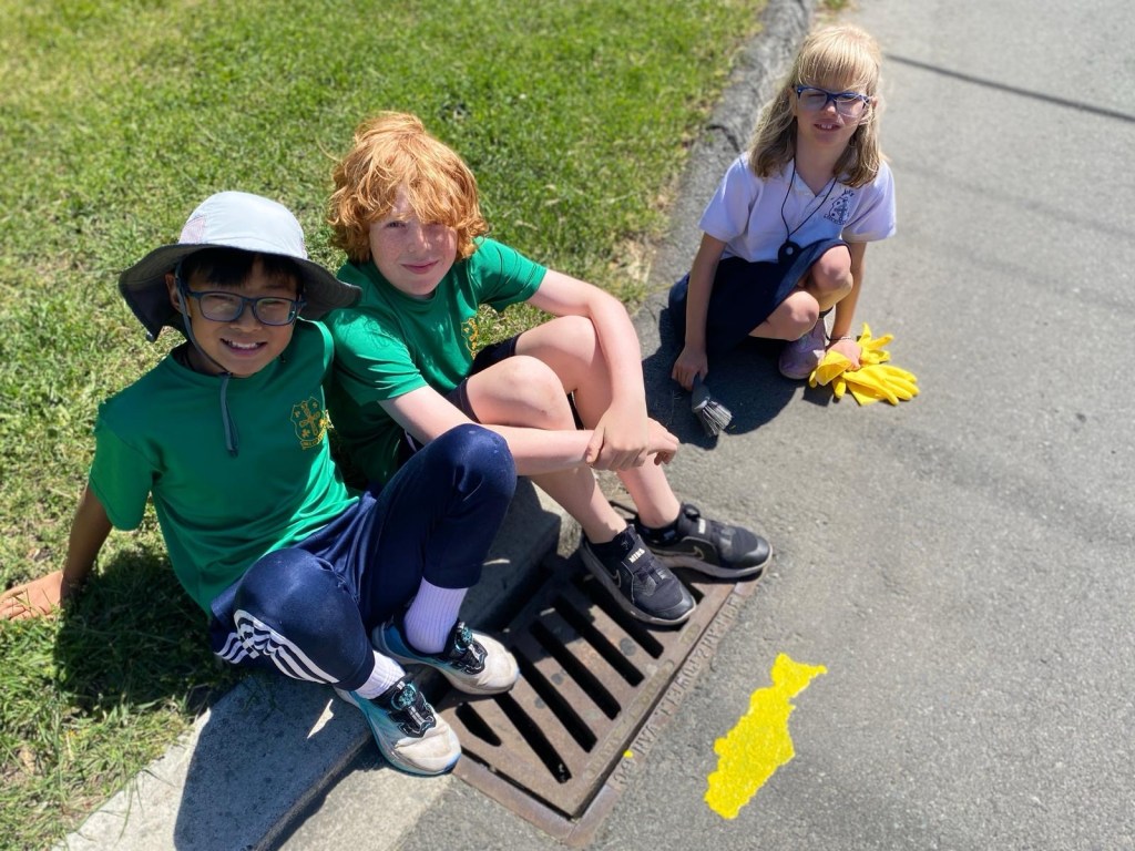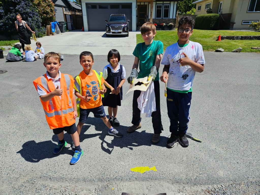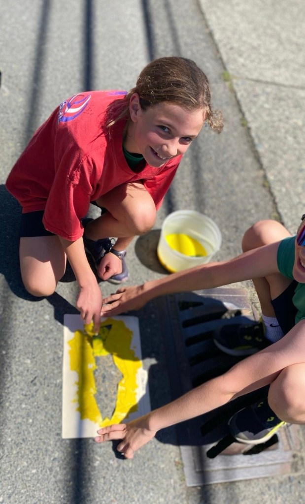 Our grade 5 class joined our grade 2 buddies in Mrs. Sikkel’s class for an afternoon of service: painting yellow salmon on the road beside our neighbourhoods’ storm drains. The purpose of the “Storm Drain Marking Program” is to raise awareness about the importance of using drains appropriately—especially because they carry water to our oceans where salmon live. This was a meaningful connection to our “water” unit from term two—and a powerful, personal reminder to us all that we are responsible for keeping this world clean, safe and healthy for all. Thank you, Mrs. Sikkel, for organizing this big project and for inviting us to join in!