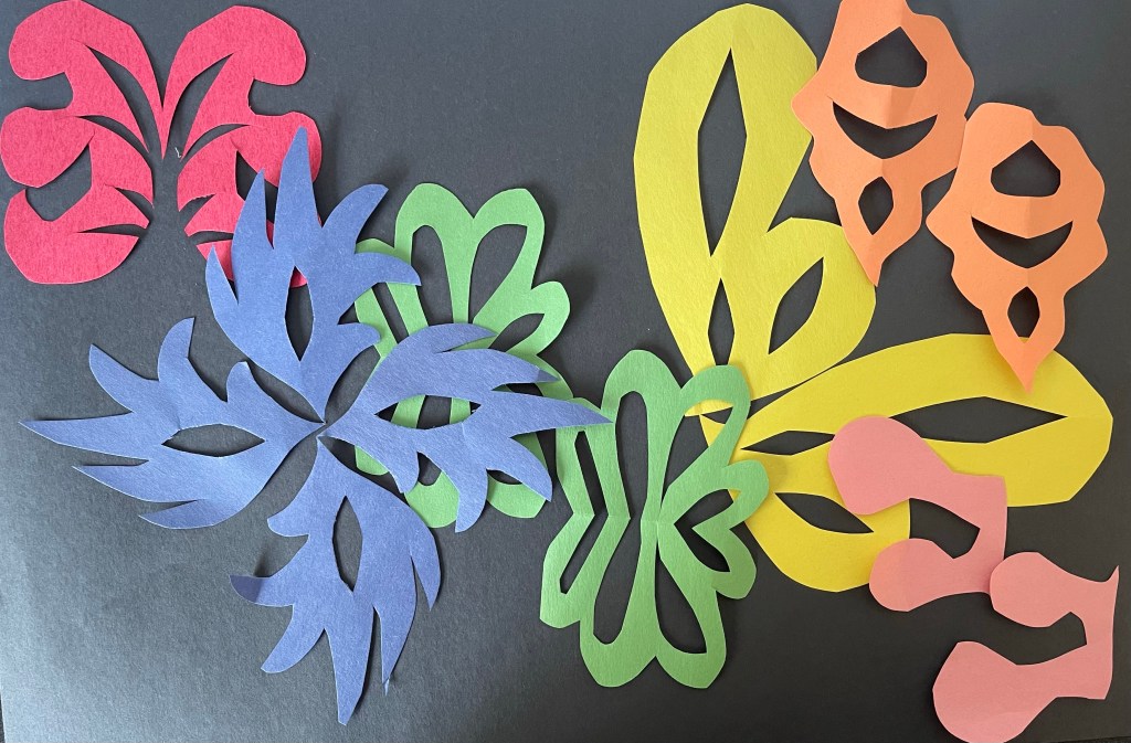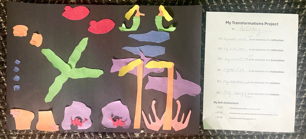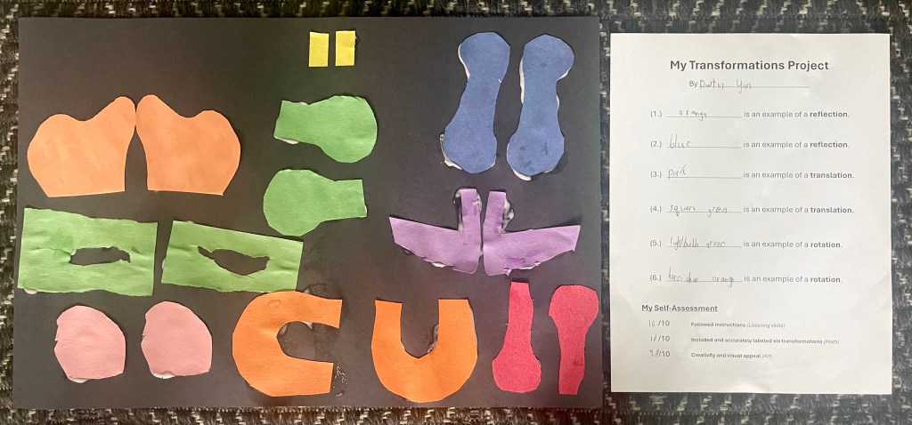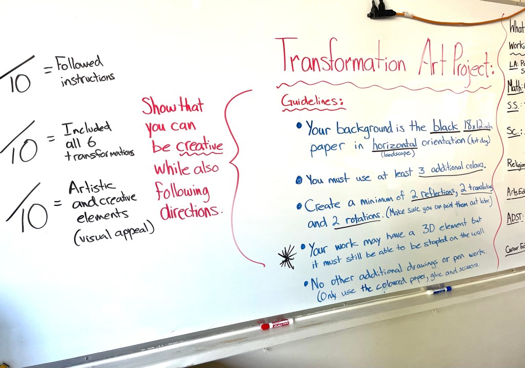 Also, students are working on a creative mathematical project on transformations. Each student is making a bold graphic representation of reflection, translation, and rotation.