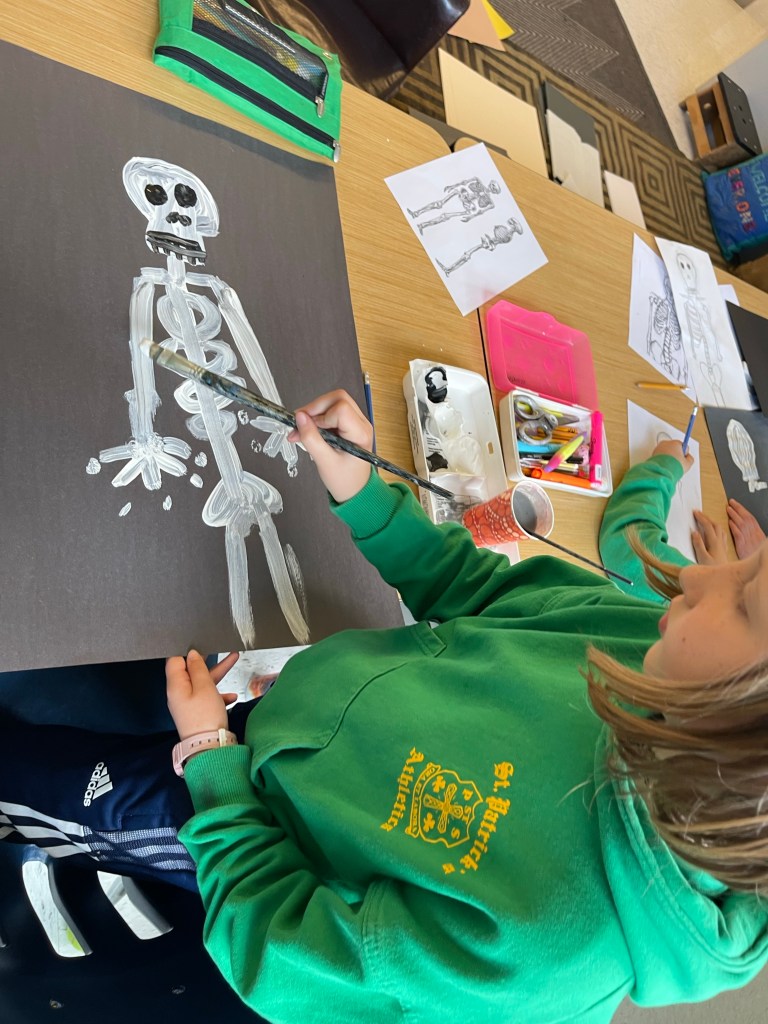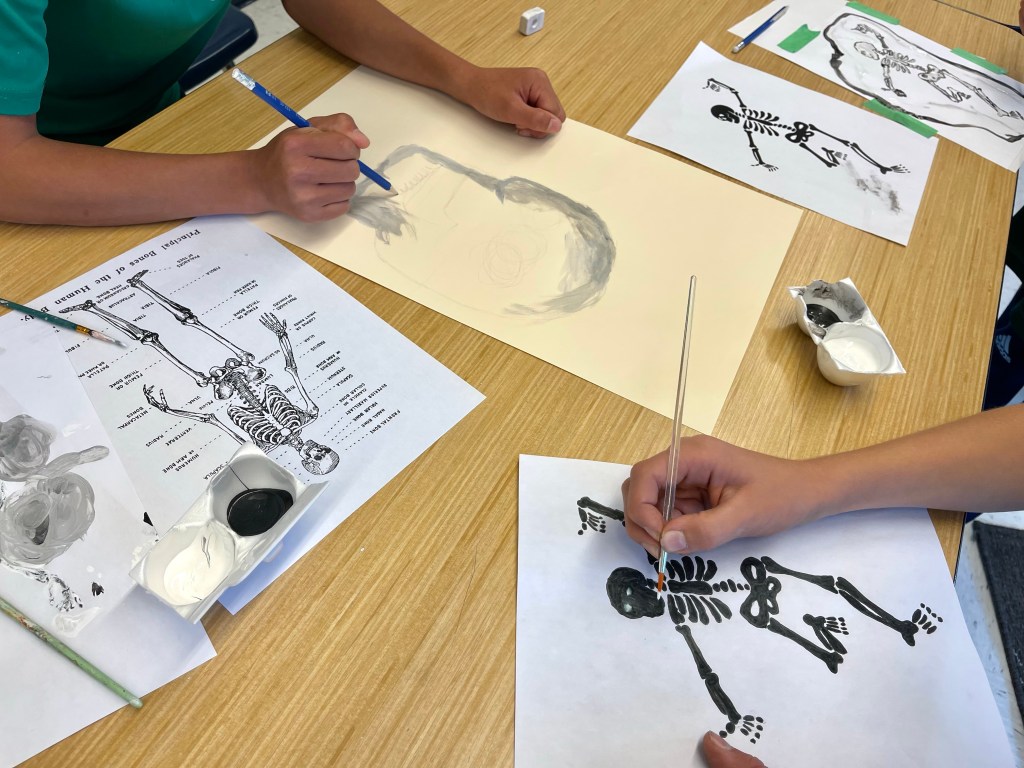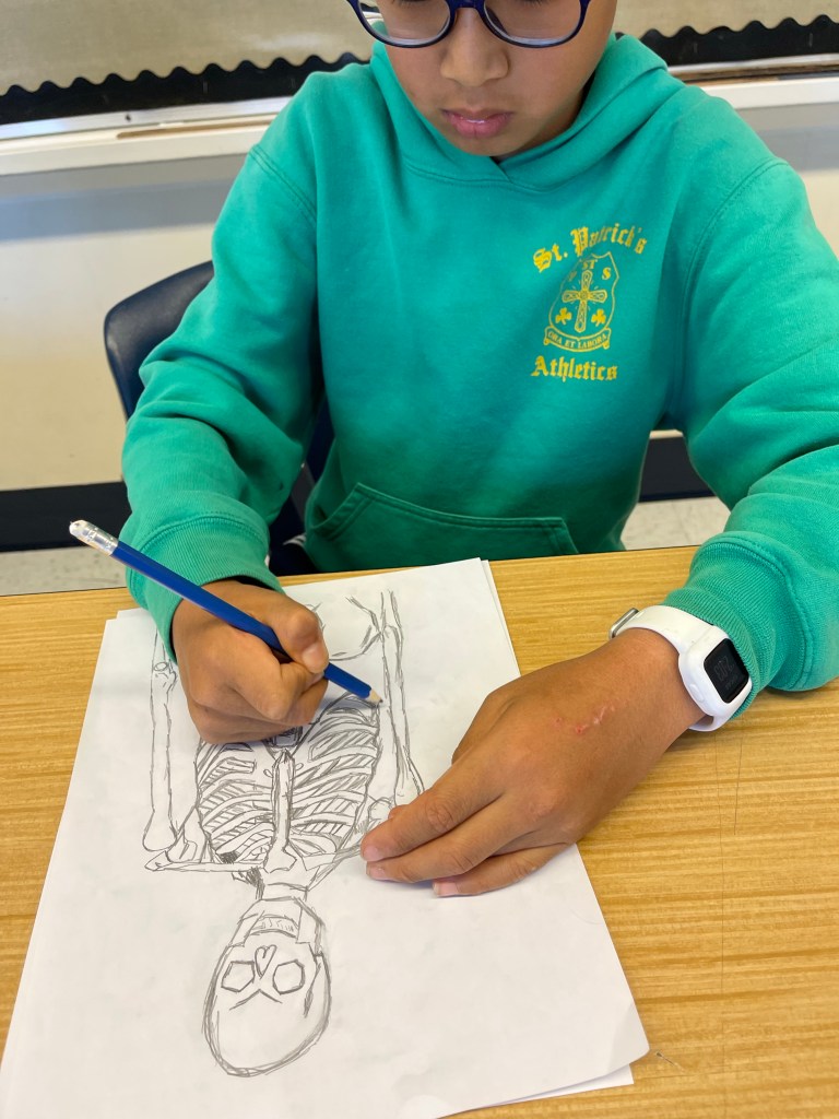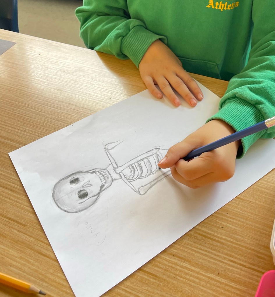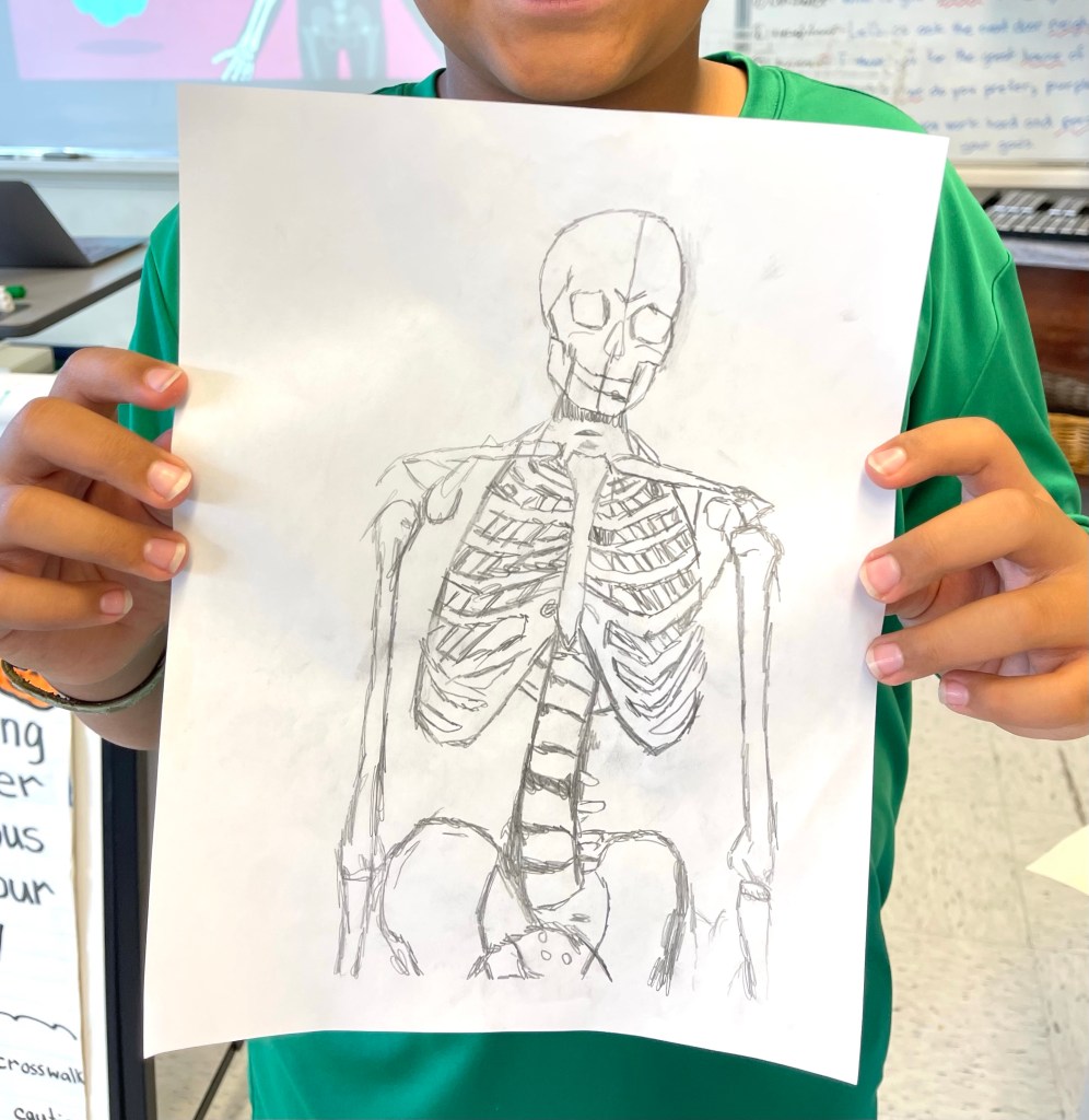 Today we previewed our next Science unit on the skeletal system with a short video and by doing some “Halloween Skeleton Art”; students were invited to do pencil sketches or paint. The goal was to have fun while starting to notice the ways the parts of the human skeleton fit together.