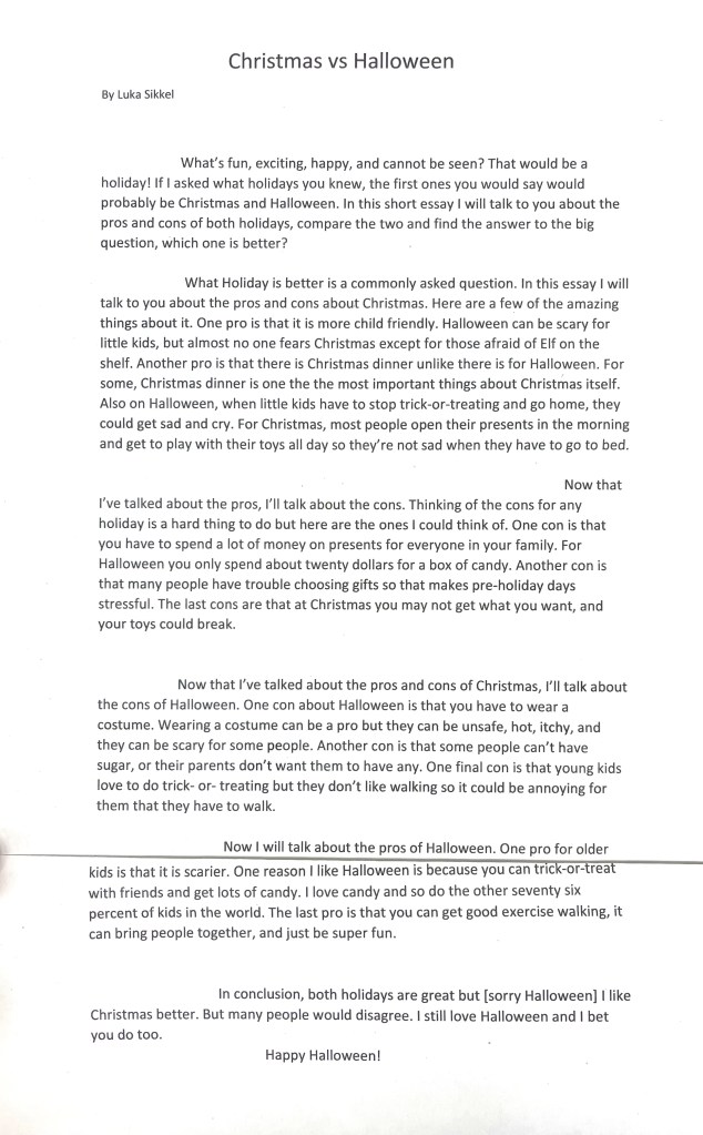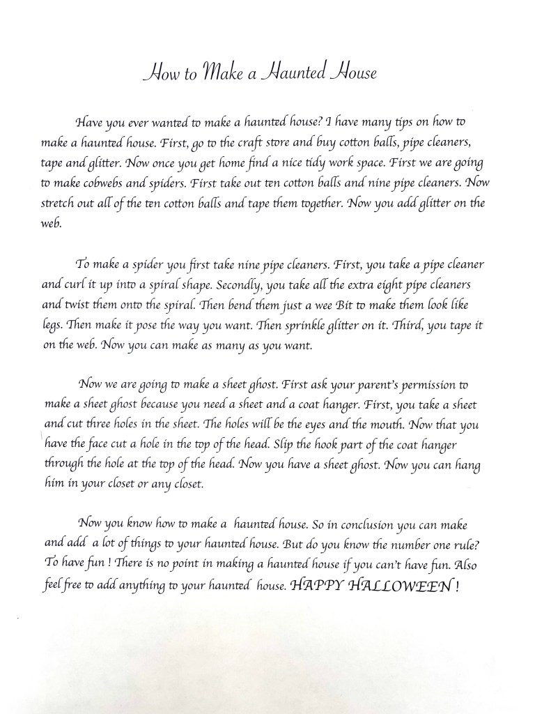 The purpose of this task was to familiarize students with the features of great writing and to reflect upon the ways their own writing is similar and dissimilar to each of the writing samples. We will continue working on these Halloween expository pieces this week through the proofreading and revising stages. (Students looking for extra writing practice and support may always write additional works for me, and I am happy to provide feedback.)
