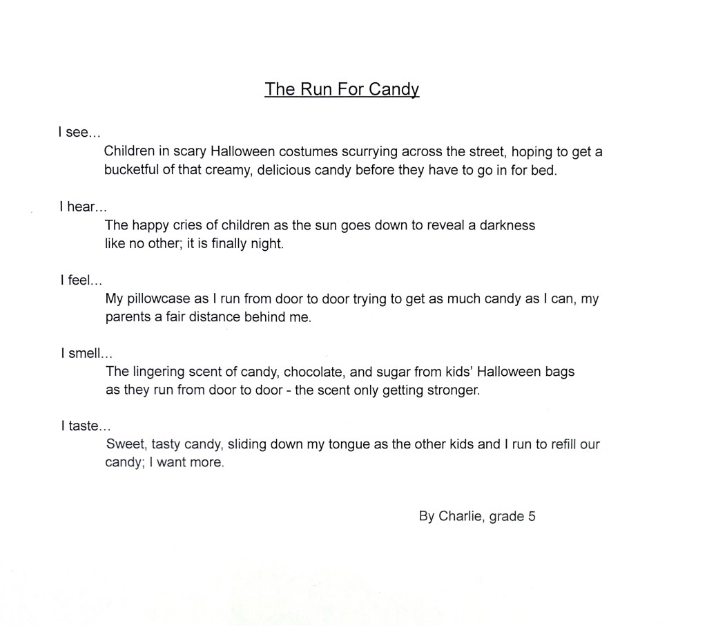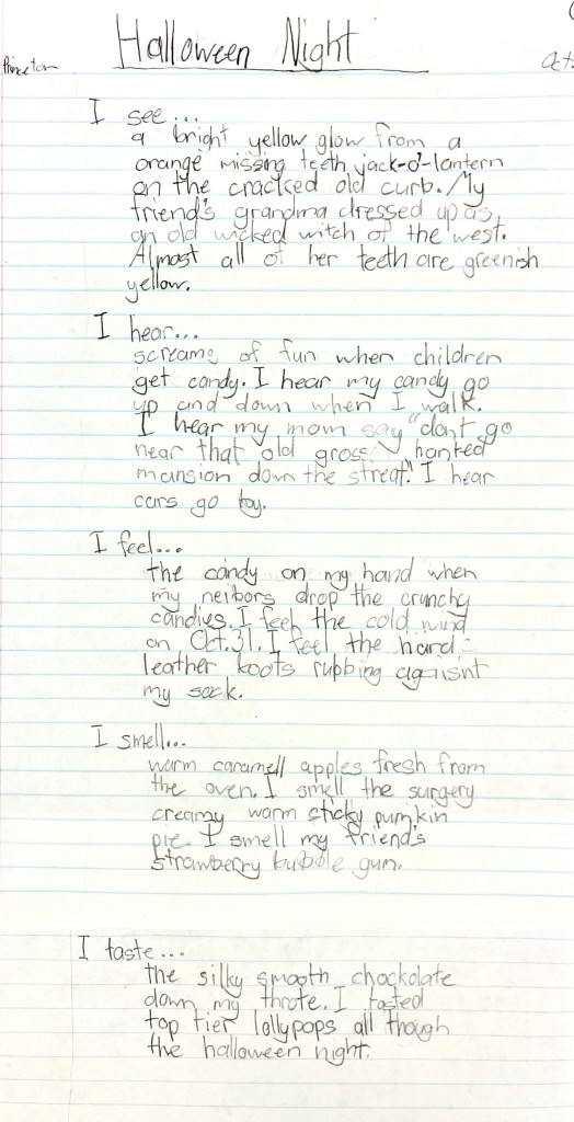 Well, tomorrow’s challenge is for students to show what they learned exploring when they explore a more timely theme: Halloween. They will independently create their own mindmaps about what they imagine they might see, hear, taste, touch and smell on October 31st. These mindmaps will inspire Halloween poetry writing later in the week.