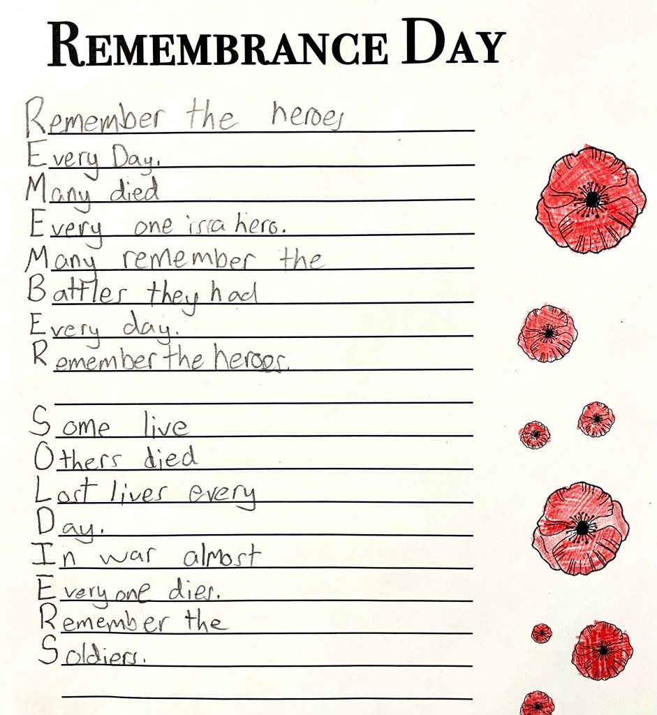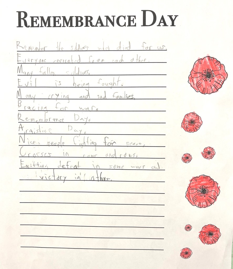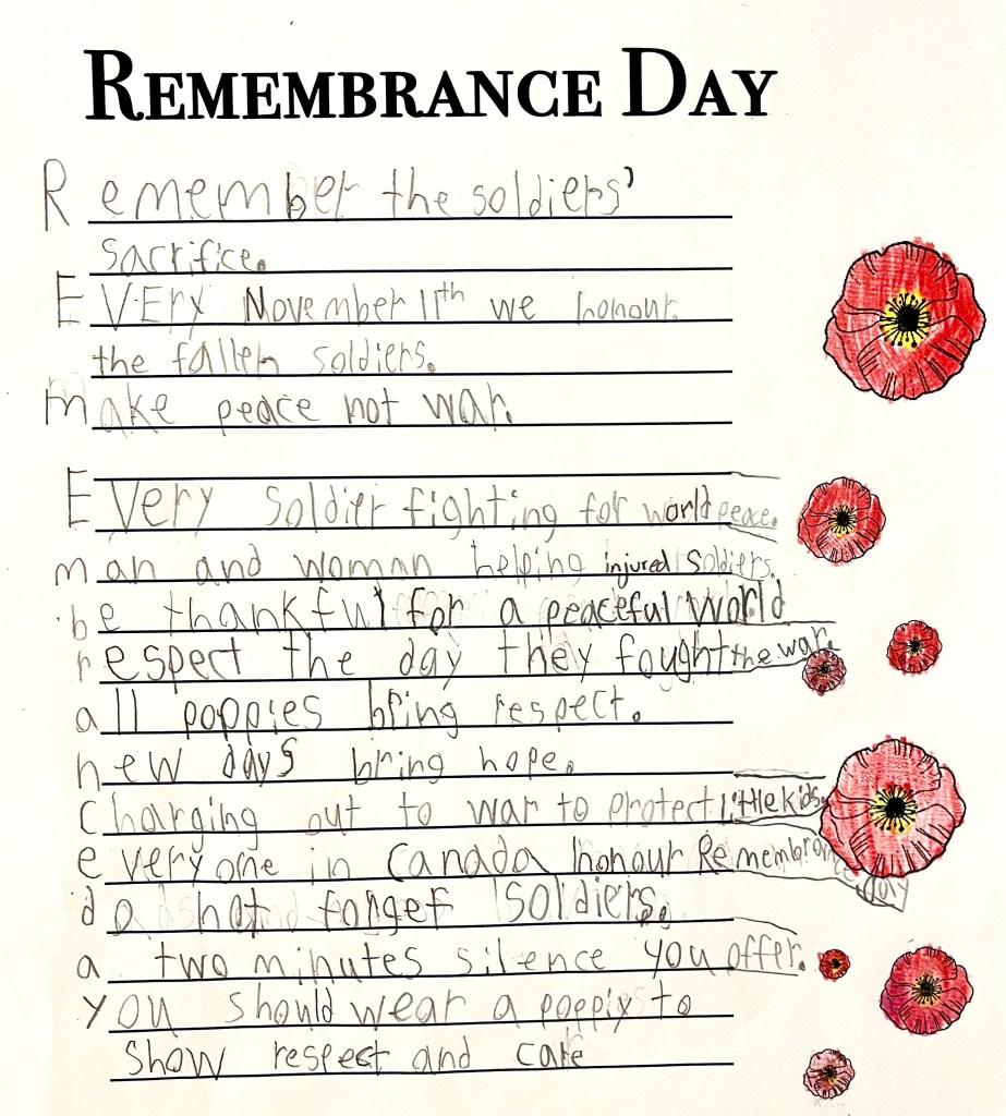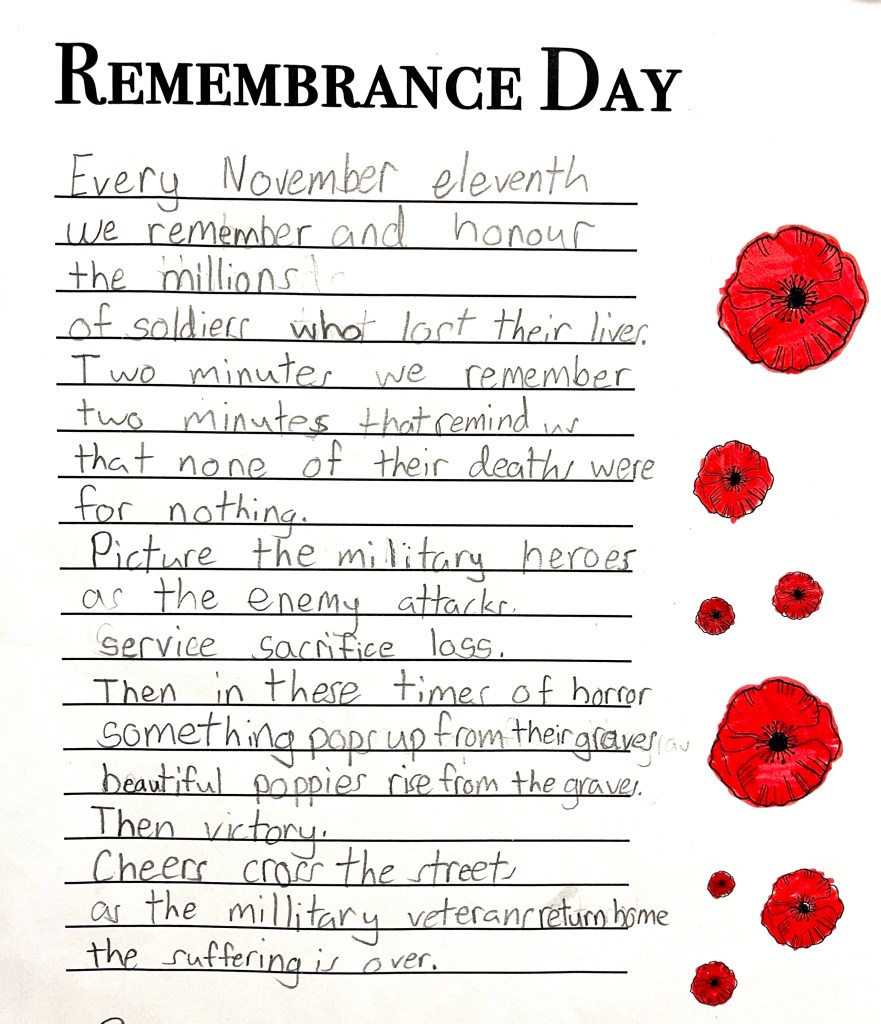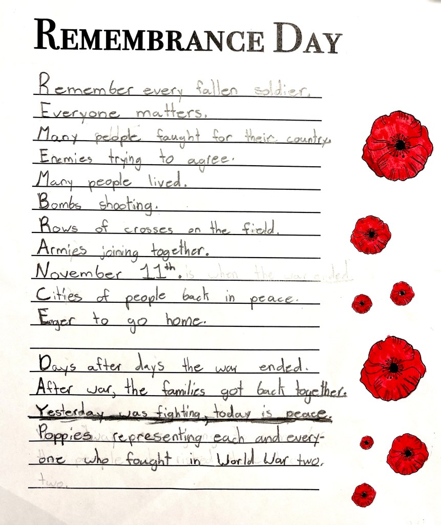 In Social Studies, we have been investigating the history of Canadian involvement in WWI and WWII and the meaning behind Remembrance Day (Nov. 11), as well as National Indigenous Veteran’s Day (Nov. 8). Students have been expressing their learning through multiple creative modes, including by writing Remembrance Day poems. We are also preparing a special video performance of “In Flander’s Fields” for sharing on the blog this Friday.