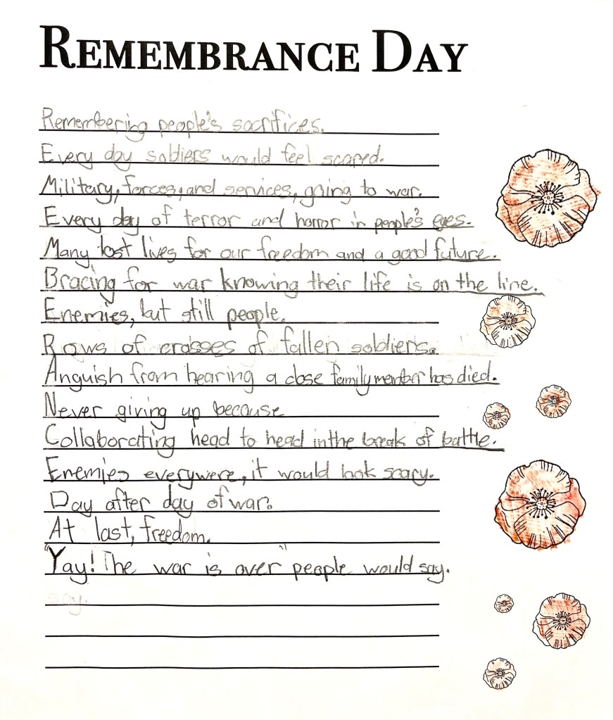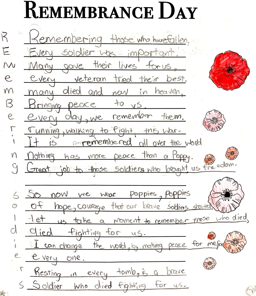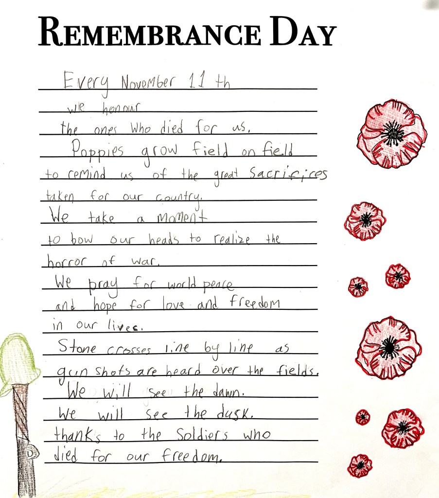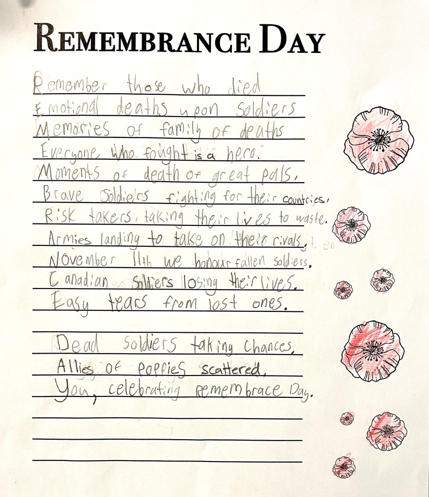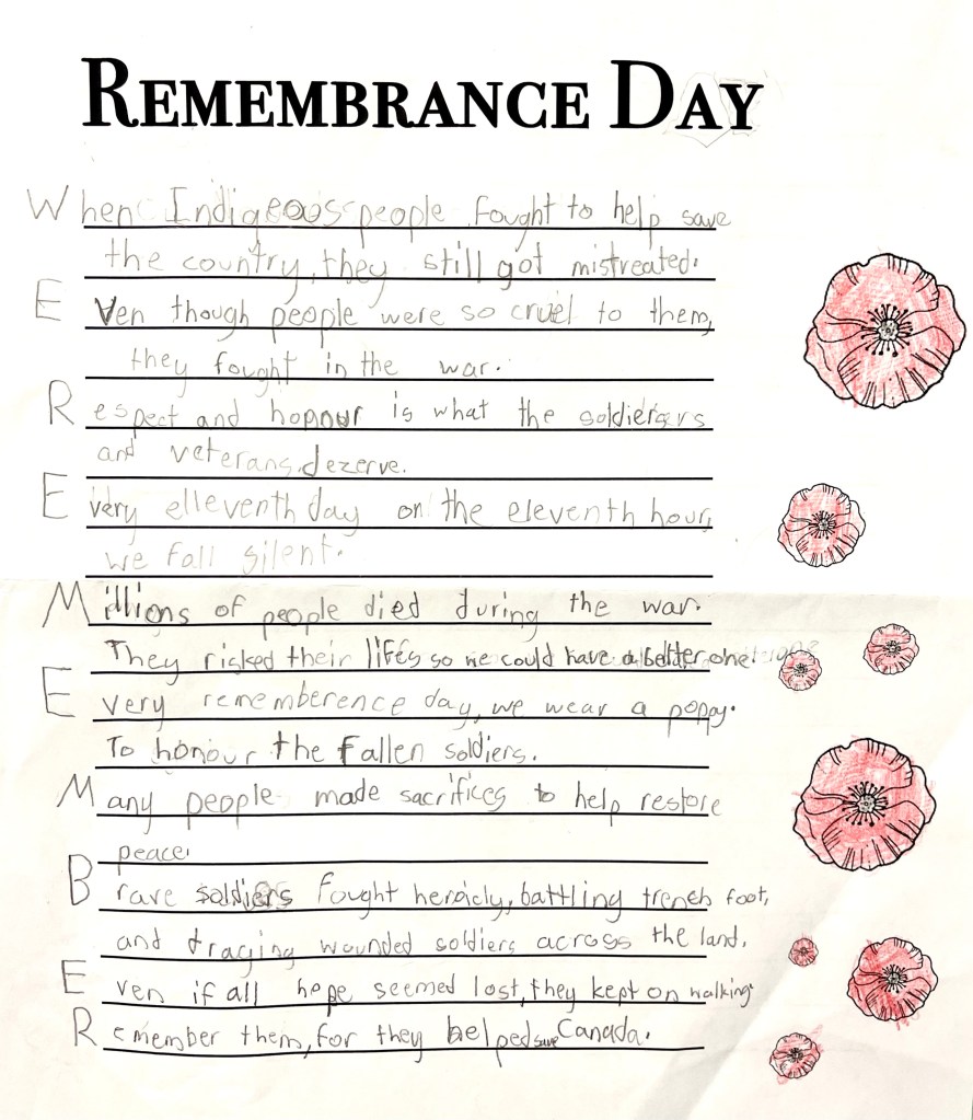 In Social Studies, we have been investigating the history of Canadian involvement in WWI and WWII and the meaning behind Remembrance Day (Nov. 11), as well as National Indigenous Veteran’s Day (Nov. 8). Students have been expressing their learning through multiple creative modes, including by writing Remembrance Day poems. We are also preparing a special video performance of “In Flander’s Fields” for sharing on the blog this Friday.
