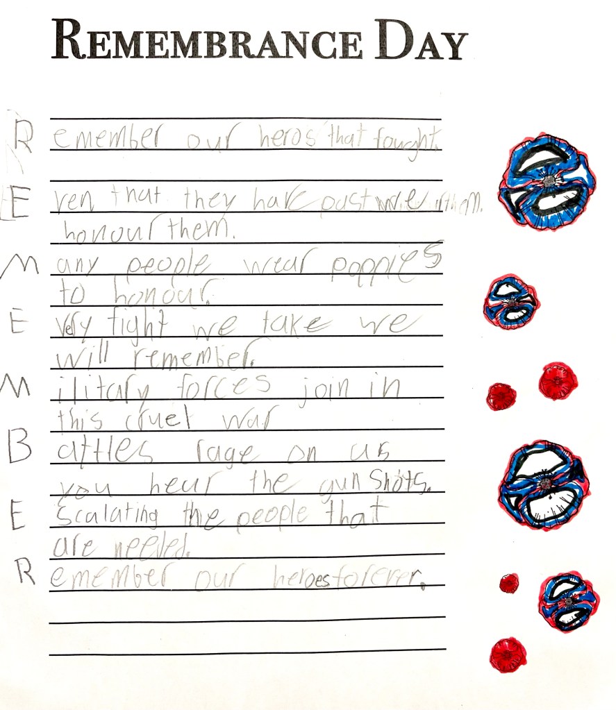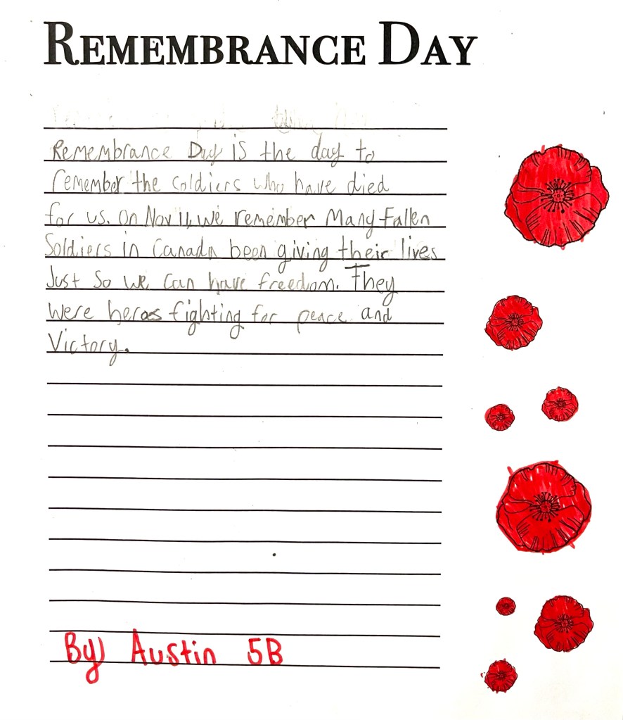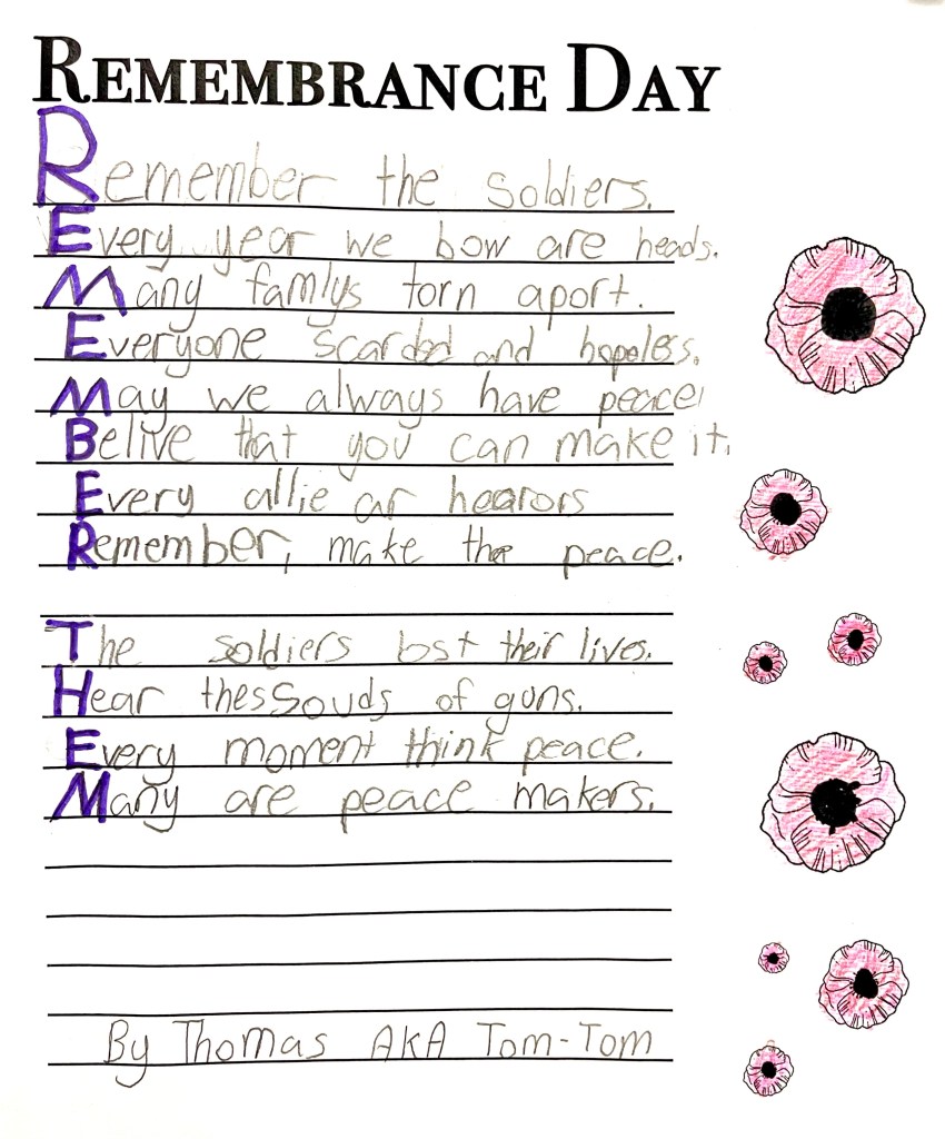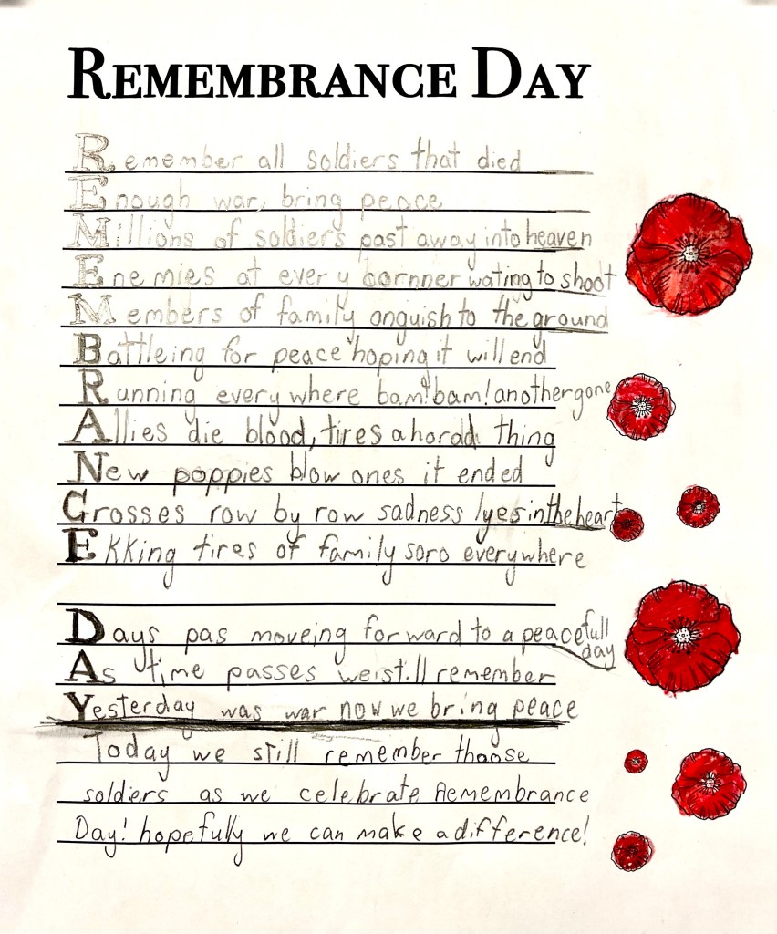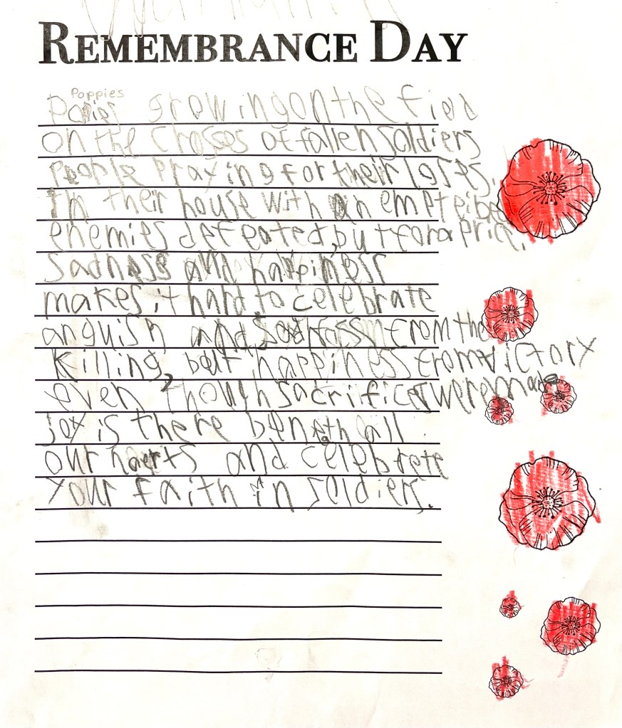 In Social Studies, we have been investigating the history of Canadian involvement in WWI and WWII and the meaning behind Remembrance Day (Nov. 11), as well as National Indigenous Veteran’s Day (Nov. 8). Students have been expressing their learning through multiple creative modes, including by writing Remembrance Day poems. We are also preparing a special video performance of “In Flander’s Fields” for sharing on the blog this Friday.