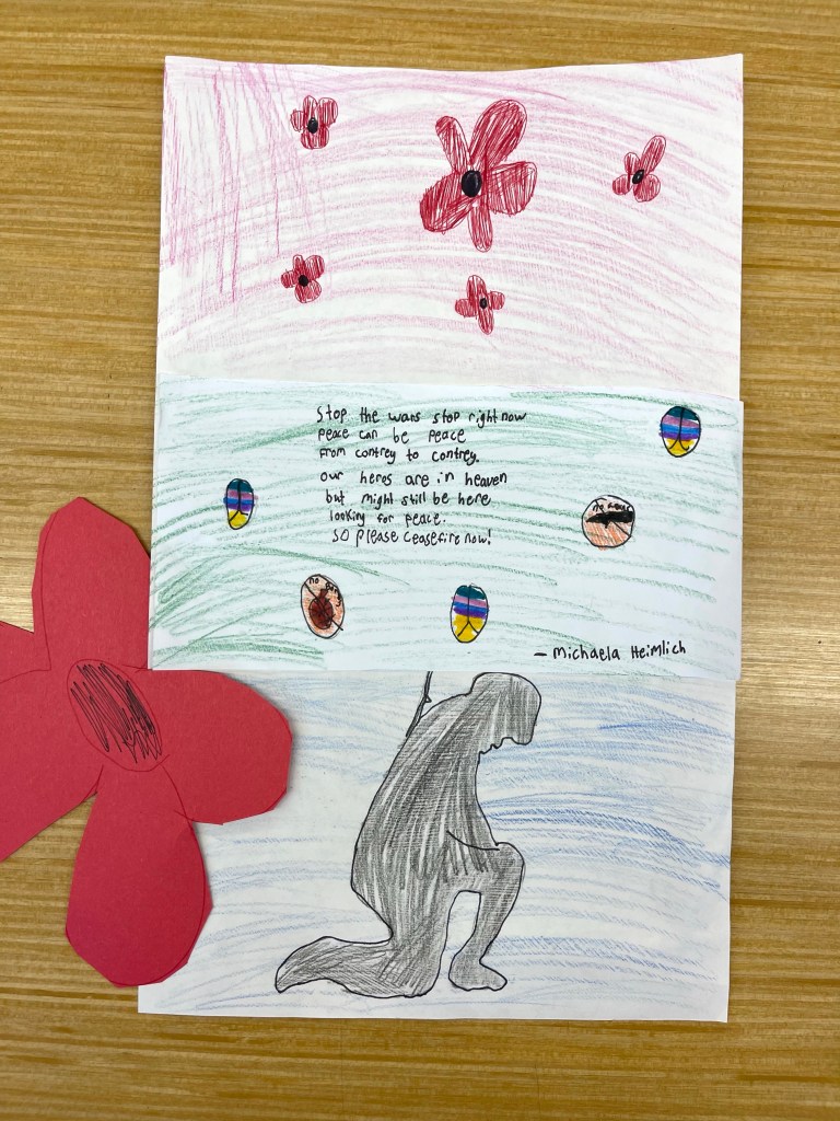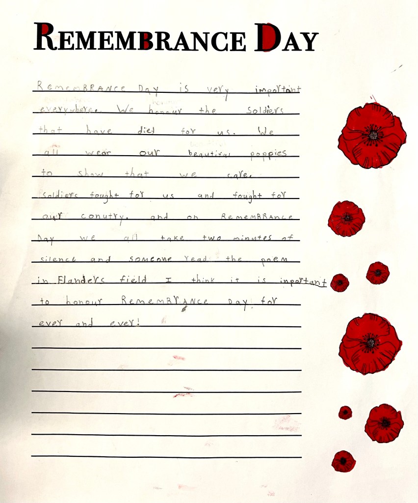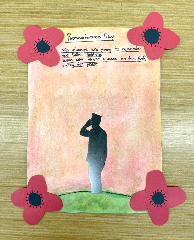 Today we held our Remembrance Day assembly to honor the members of the armed forces who died in the line of duty during World War I and subsequent conflicts. We have been reflecting all week upon the sacrifices made by military personnel and the courage and dedication of those who fought for their country. We have been discussing the impact of war on society and the importance of promoting peace in big and small ways.