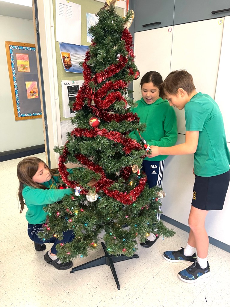 Today in Language Arts our students did a “Five Senses Visualization”, which was a series of open-ended questions inspiring them to imagine what they might experience on Christmas Day. We shared ideas, and I modelled how to organize thinking using a “Five Senses Mindmap”. We discussed how to transform simple descriptions into richer descriptive language. (For example, “I see mistletoe” might become “The freshly plucked mistletoe hangs in the doorway, its green leaves frosted and white berries glistening.”)