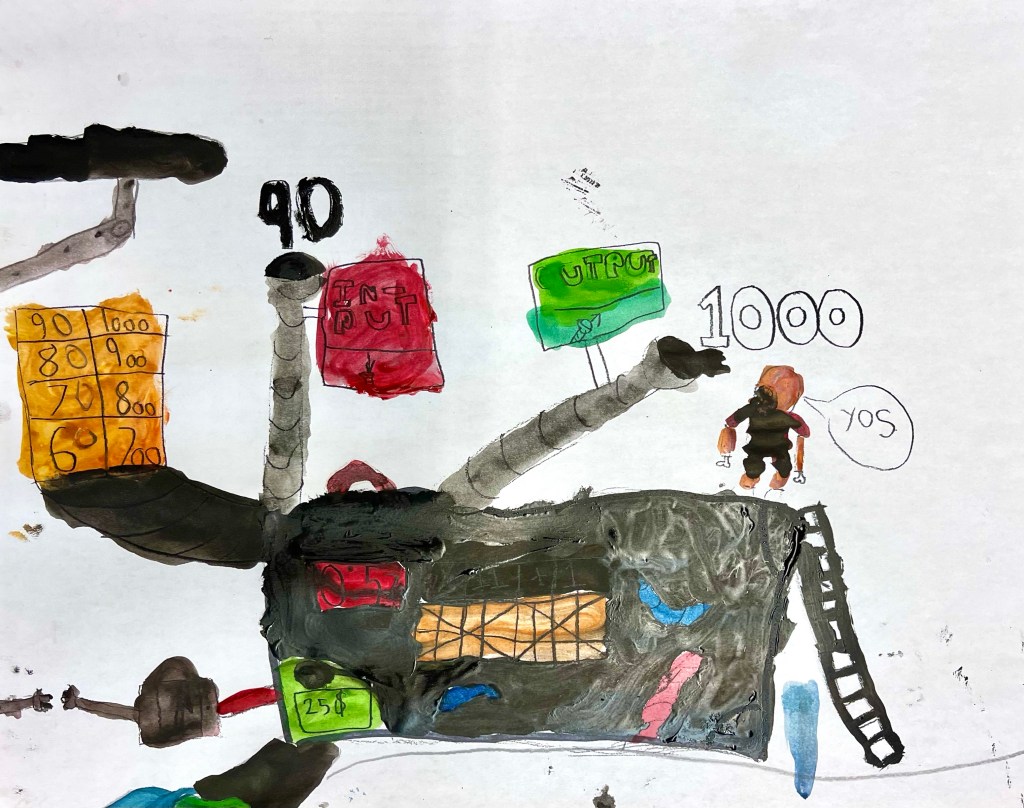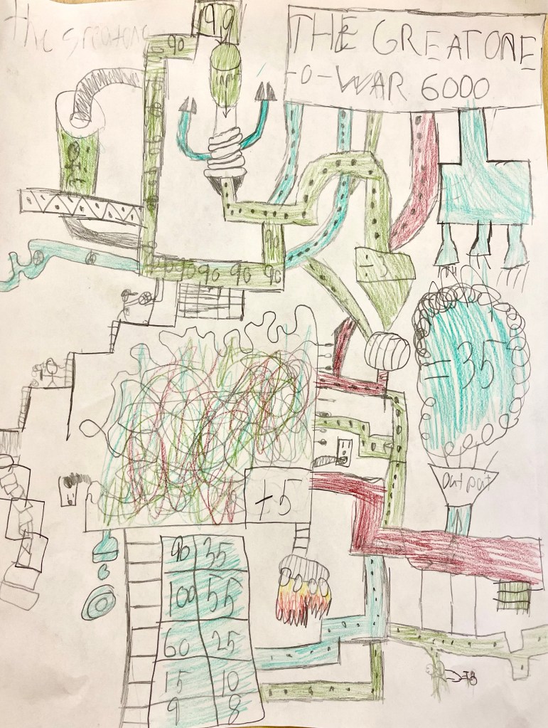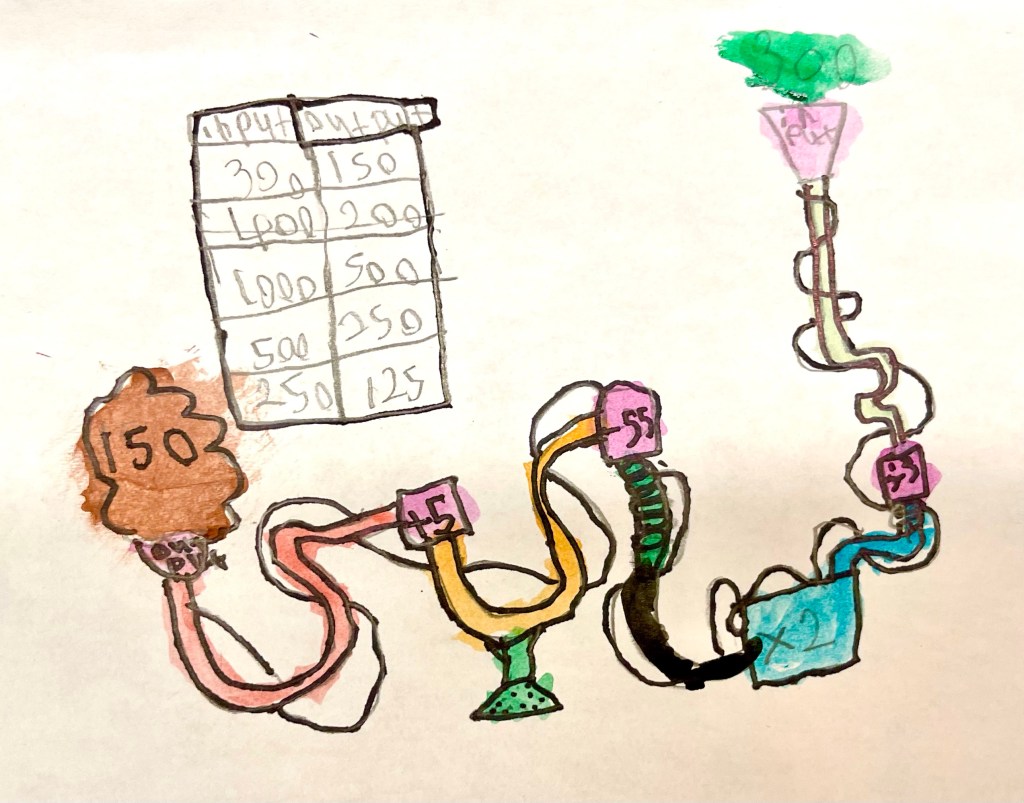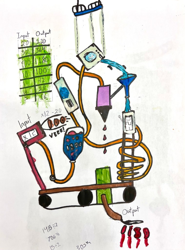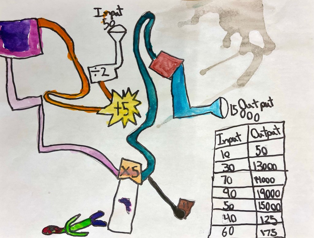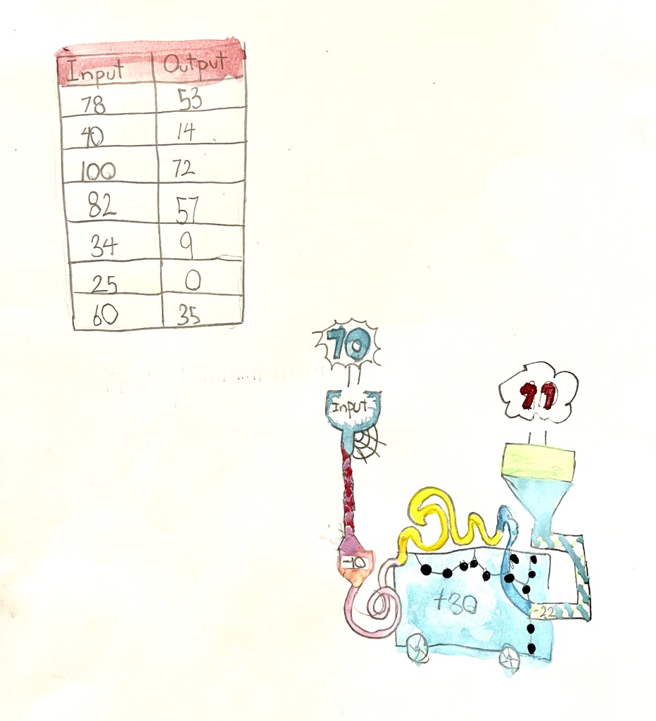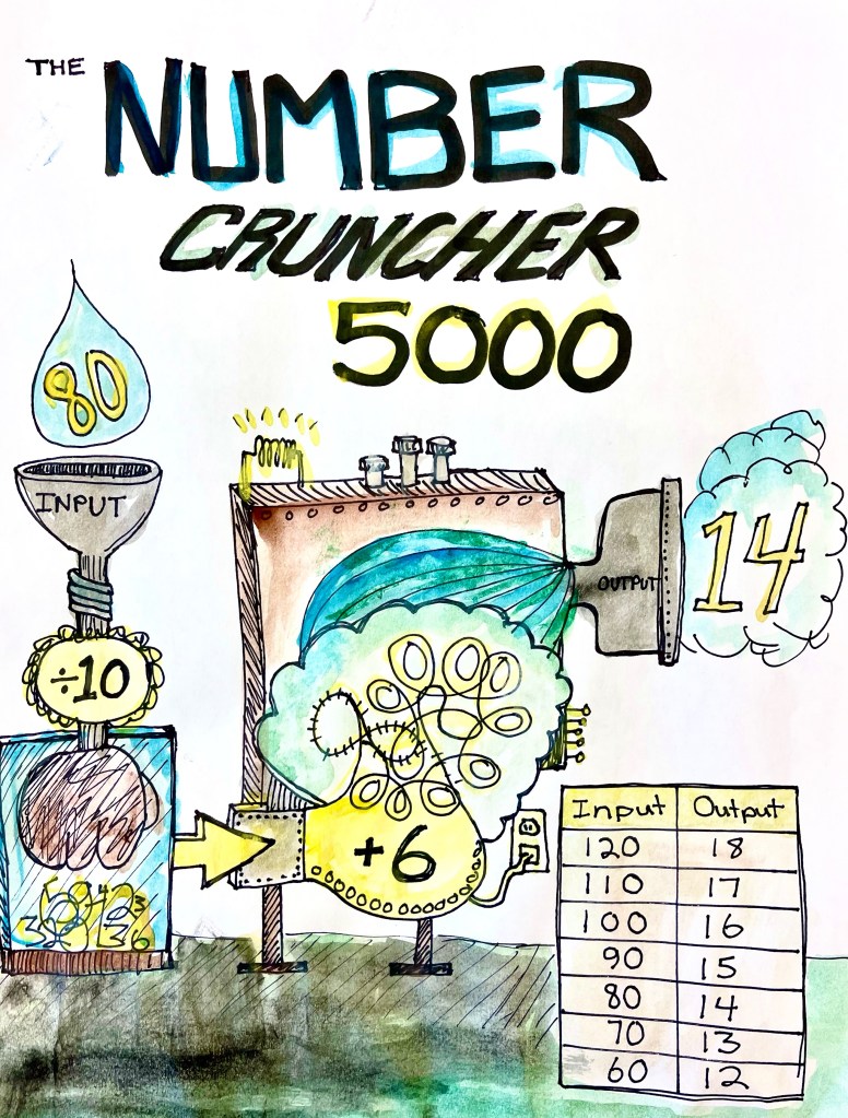 The students finished their Math-Art challenge of designing a “Function Machine”. The creative invitation was for each student to design a one-step, two-step, three-step or four-step “input-output” table and then illustrate a silly machine that would perform the function rule. For example, in “The Number Cruncher 5000” above, when a number 80 is inputted, it gets divided by 10 to make 8. Then that 8 is added with 6 to output 14.